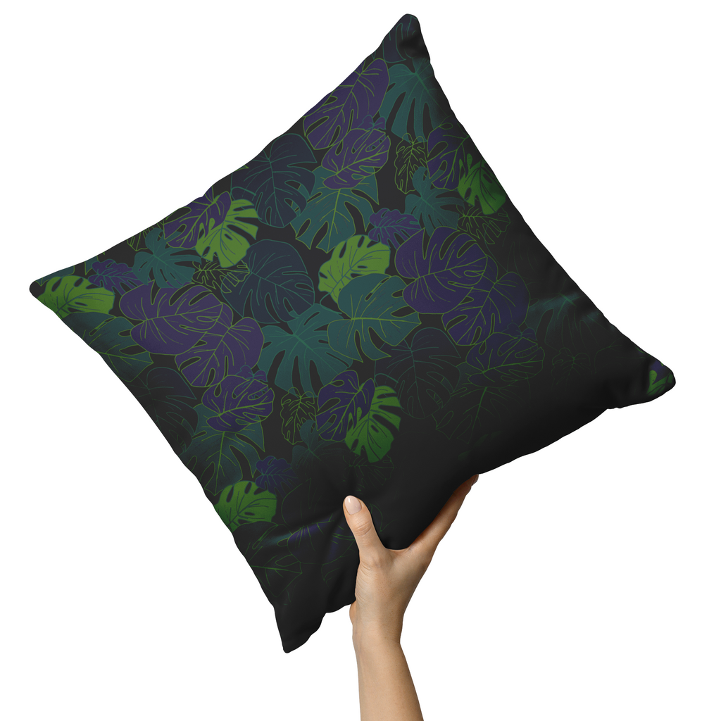 Transform your living space with this elegant throw pillow, featuring a captivating pattern of green and purple Monstera plant leaves on a black background. Made from 100% polyester microfiber, the fabric is soft, durable, and wrinkle-resistant. The hidden zipper closure ensures easy insertion and removal of the pillow insert, maintaining a seamless and sophisticated look.