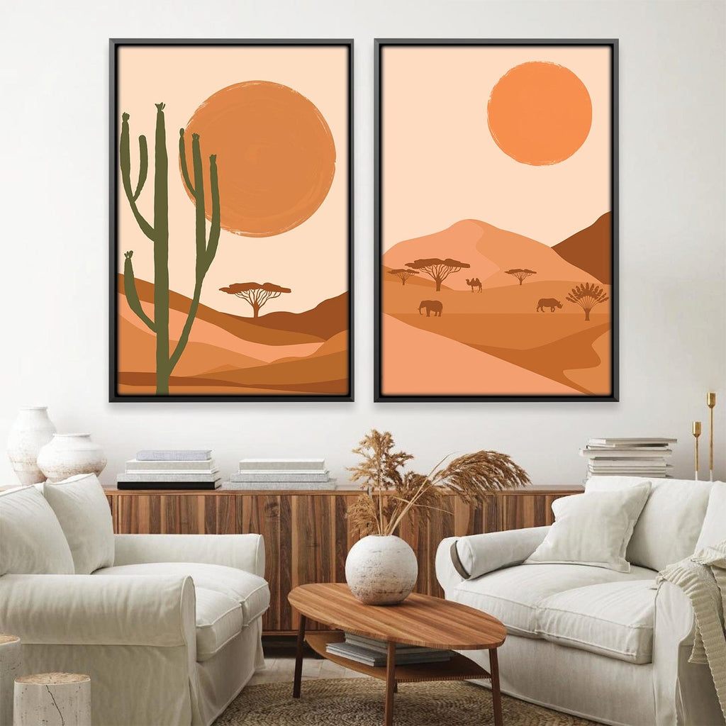 Experience the tranquil beauty of our "Desert Suns" Canvas Wall Art. This minimalist illustration captures the essence of the desert with a large sun hovering above, casting a warm glow on the arid landscape. The title "Desert Suns" aptly conveys the serene radiance of the scene, inviting you to bask in the peaceful ambiance of the desert. With a soothing palette of brown and cream, this artwork adds a touch of natural elegance to any space. Available as canvas wall art and framed wall art, it effortlessly transforms your décor into a captivating visual story.