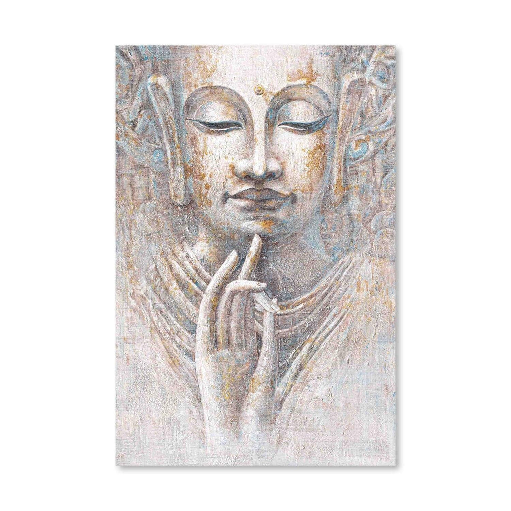 Give any open wall in your home a tasteful touch of glamour with this hand painted oil painting. This painting showcases Buddha featuring grey, brown, white and yellow brush strokes hand painted by the artist.