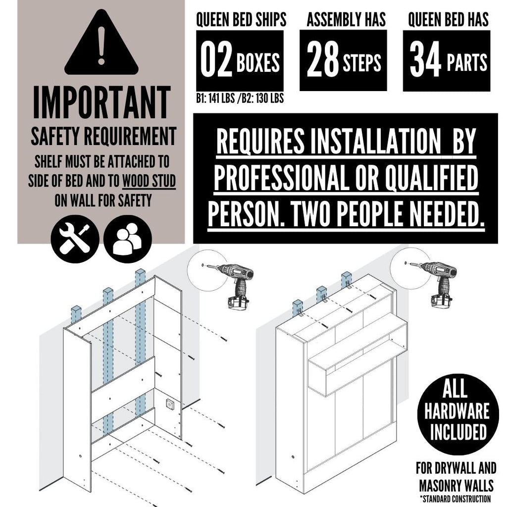 - The Queen Murphy Wall Bed comes with locking pins, the piston easy lift system, a mattress secure strap, mounting hardware, and a display shelf.