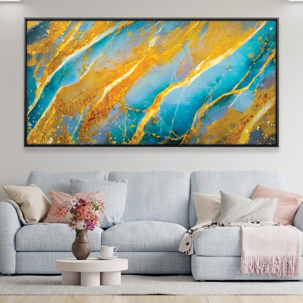 Immerse yourself in the allure of "Eldorado Stream," where a captivating abstract canvas wall art transports you to a world of opulence and tranquility. The intricate textures, featuring crystal and gold elements, evoke a sense of luxury and sophistication. With a soothing palette of gold and blue, this piece adds a touch of elegance to any space, making it an ideal choice for contemporary decor.