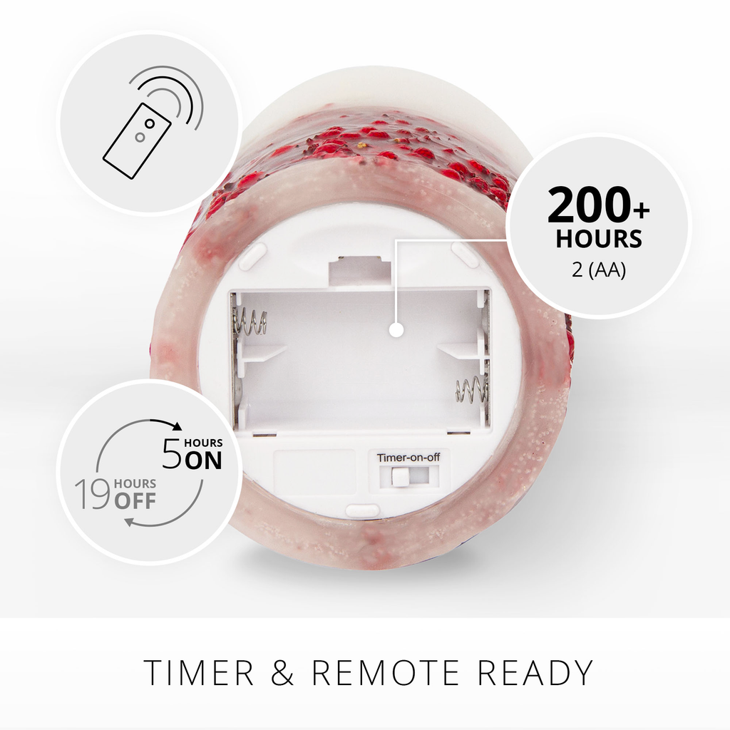 With bright red berries melted into the paraffin wax, the Red Berries Flameless Candle Pillar is the highlight of your autumn and winter décor. Real Flame-Effect technology flickers across the wax like the sun shining on the fallen snow. Display this candle with wreaths, silver plates, bronze cups and artificial plants for an old-fashioned holiday.