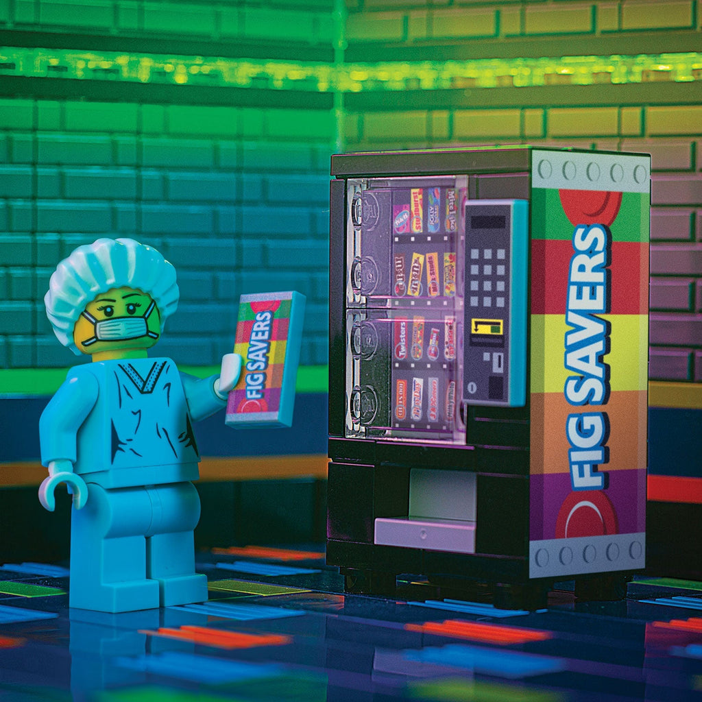 - Includes a custom printed Fig Savers candy LEGO tile.