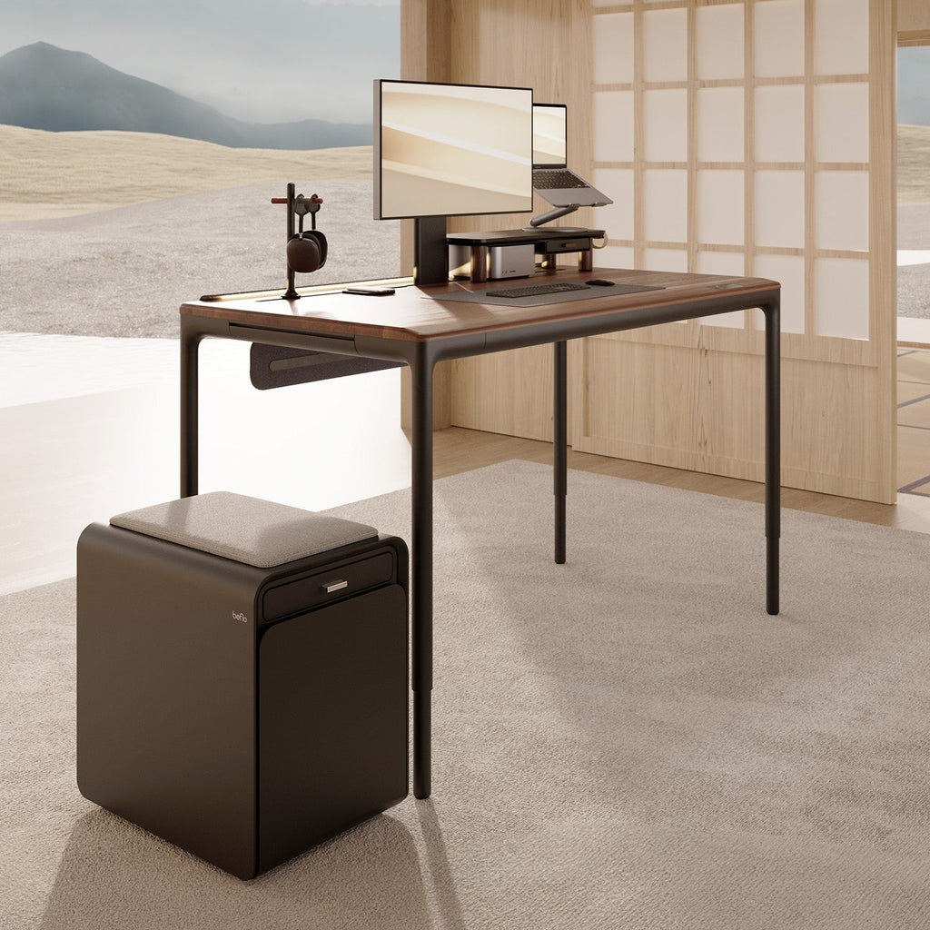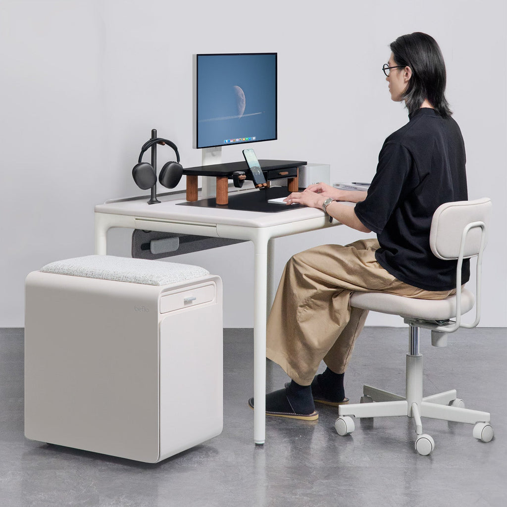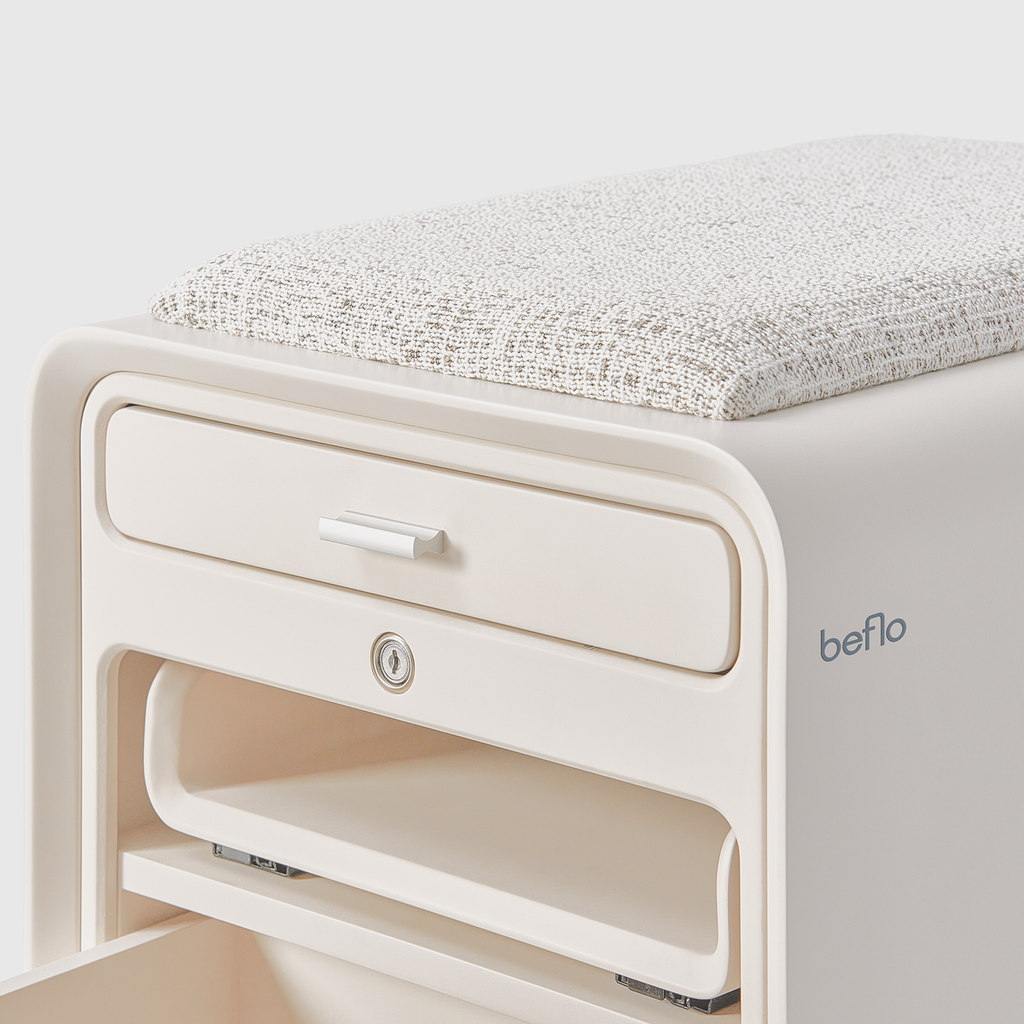 Its design conceals the wheels, bottom drawer, middle shelf, and the lock, leaving the top drawer within reach for frequently used items.