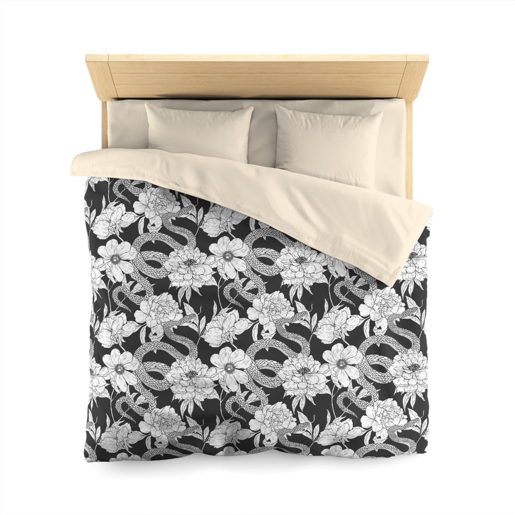 Add some contrast and elegance to your bedroom with this Garden in Gray duvet cover. This duvet cover features a pattern of intertwined flowers and snakes on a black background. The duvet cover is made of 100% polyester microfiber, which is soft, durable, and wrinkle-resistant. It has a zipper closure at the bottom that makes it easy to insert and remove your duvet, and gives it a seamless and elegant look.