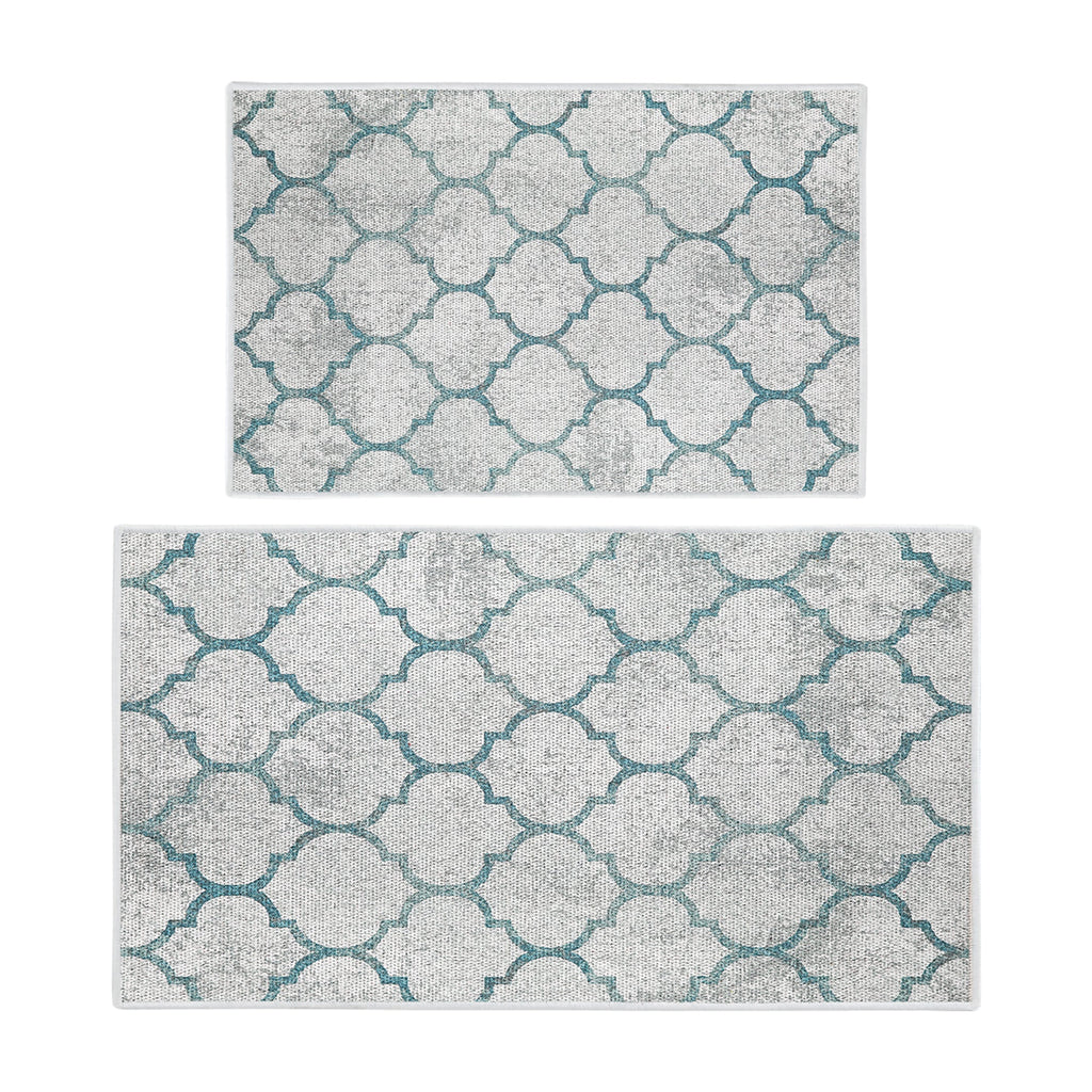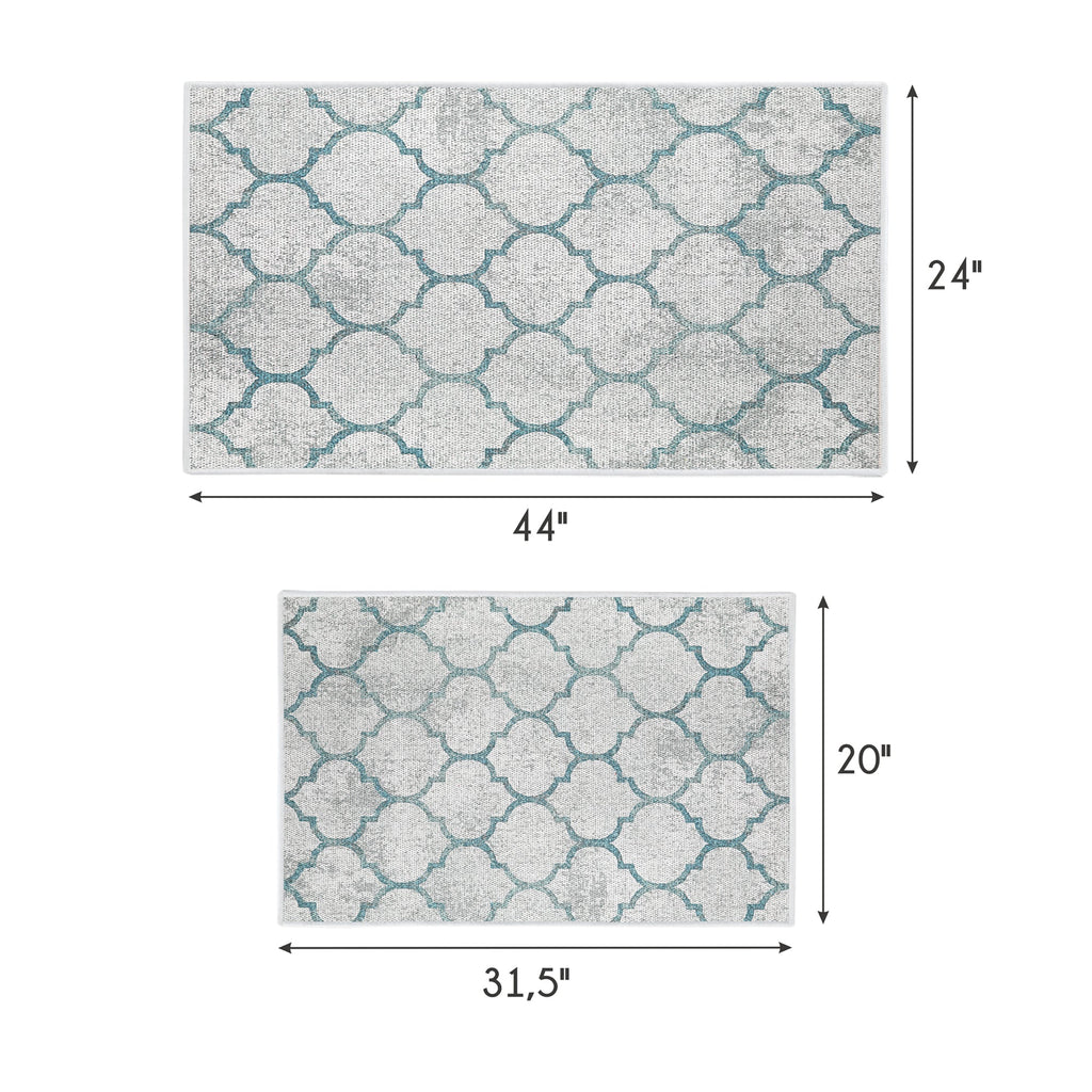 Geometric Design Non Skid Washable Kitchen Runner Rugs Set of 2| 44 x 24 and 31.5 x 20 Inches Floor Mats |Gray&Teal