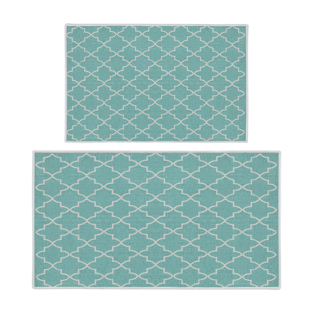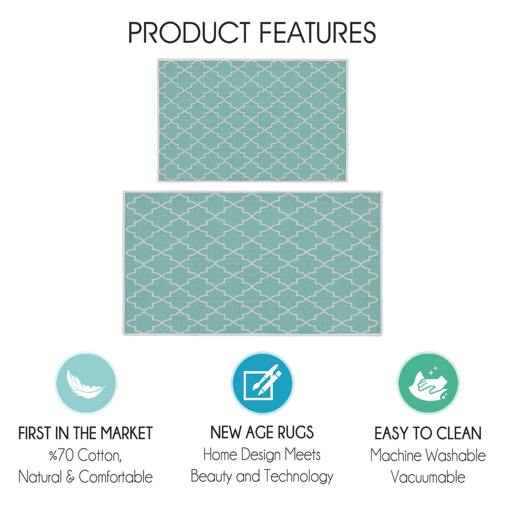 Geometric Design Non Skid Washable Kitchen Runner Rugs Set of 2| 44 x 24 and 31.5 x 20 Inches Floor Mats |Turquoise
