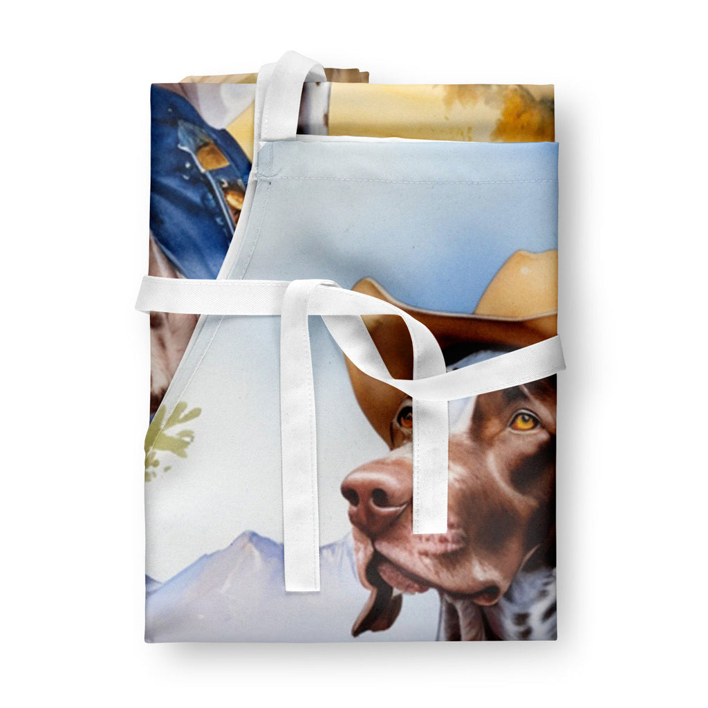Shown here is the German Shorthaired Pointer Cowboy Welcome Apron from Caroline's Treasures featuring artwork of a German Shorthaired Pointer in a Everyday design. The detailed illustration and vibrant colors make it a standout accent for your home. Saddle up and celebrate rugged charm with our Cowboy Welcome Collection. Featuring western-inspired designs that blend rustic character with warm hospitality, this collection brings frontier spirit and personality to your home and outdoor décor. Elevate your cooking, baking, and grilling experiences with our versatile Kitchen or BBQ Apron. This Bib Style apron isn't just limited to culinary activities - it also serves as an excellent baking apron, artist apron, server apron, gardening apron, or even a dog grooming apron. The apron showcases vibrant full-color artwork contributed by one of our talented artists, bringing a dash of style to your daily tasks. With dimensions of approximately 27"W x 30"H, it provides ample coverage to protect your clothing from spills and splashes. Our apron is meticulously crafted from 100% Ultra Spun Polyester, known for its durability and lightweight nature. The apron comes with white tie straps, ensuring a comfortable and adjustable fit for all. It's a perfect choice for kitchen apron enthusiasts, whether you are a woman or a man. Designed for easy maintenance, this apron is fully machine washable. The quick-drying polyester material actively reduces staining, keeping your apron looking fresh and new for longer. Our beautifully designed apron isn't just a functional kitchen accessory - it's a fashion statement in the culinary world! German Shorthaired Pointers are athletic sporting dogs known for their intelligence and endurance. This versatile breed is admired for its versatility, loyalty, and strong hunting instincts. Makes a heartfelt gift for: German Shorthaired Pointer owners, Dogs lovers, Everyday gifts, pet parents, friends who adore their German Shorthaired Pointer, or anyone celebrating Dogs.