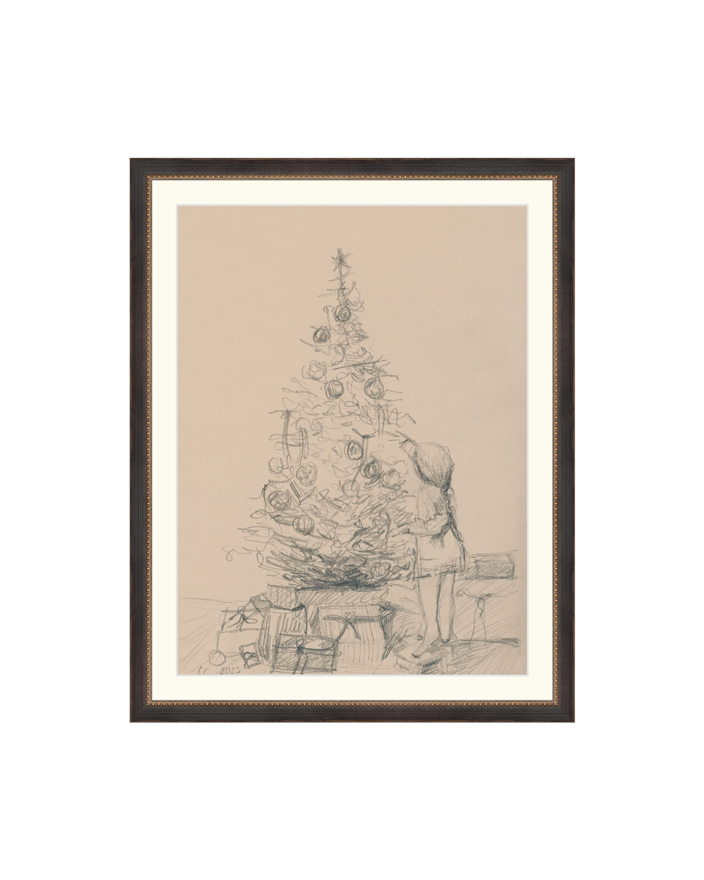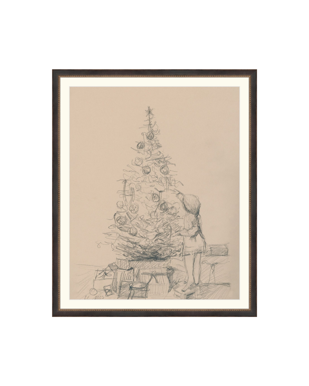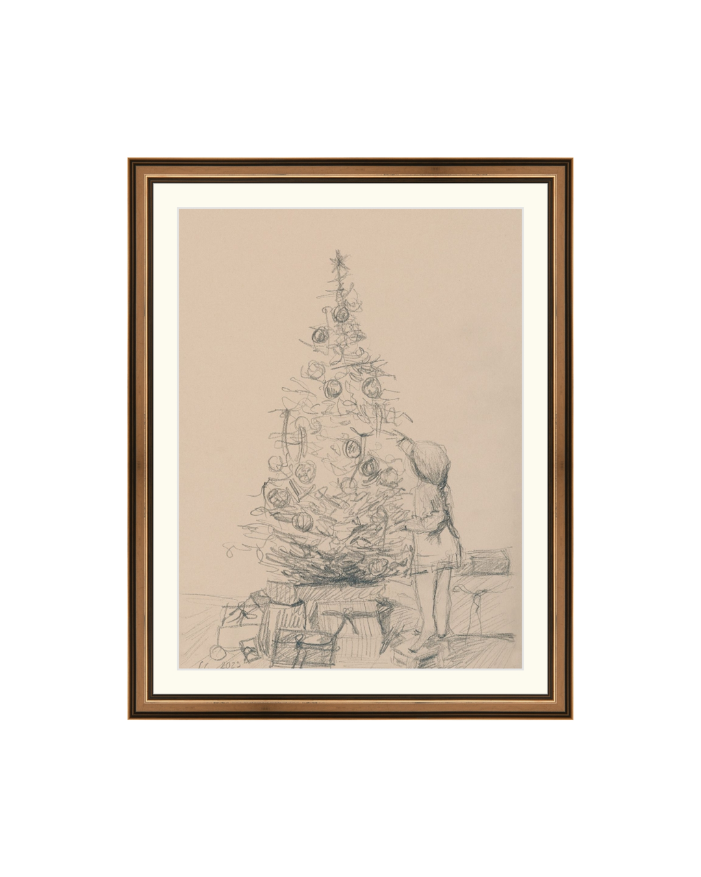 Print of a charcoal drawing by Lucia Chinaleong depicting a girl decorating a Christmas Tree.