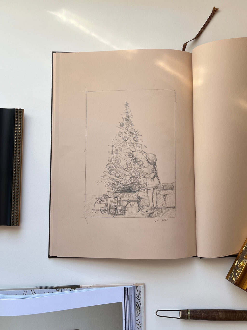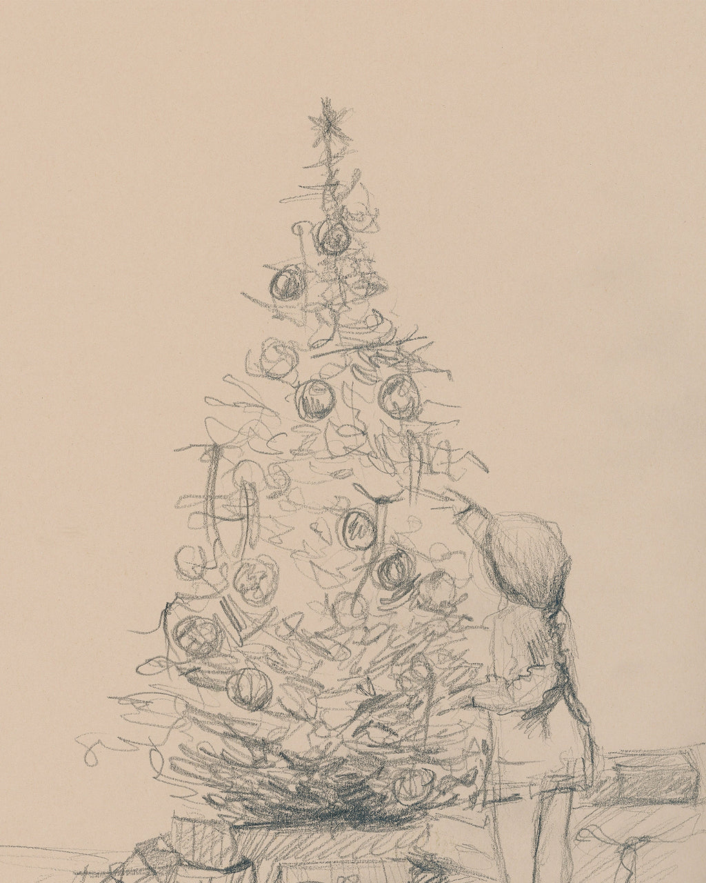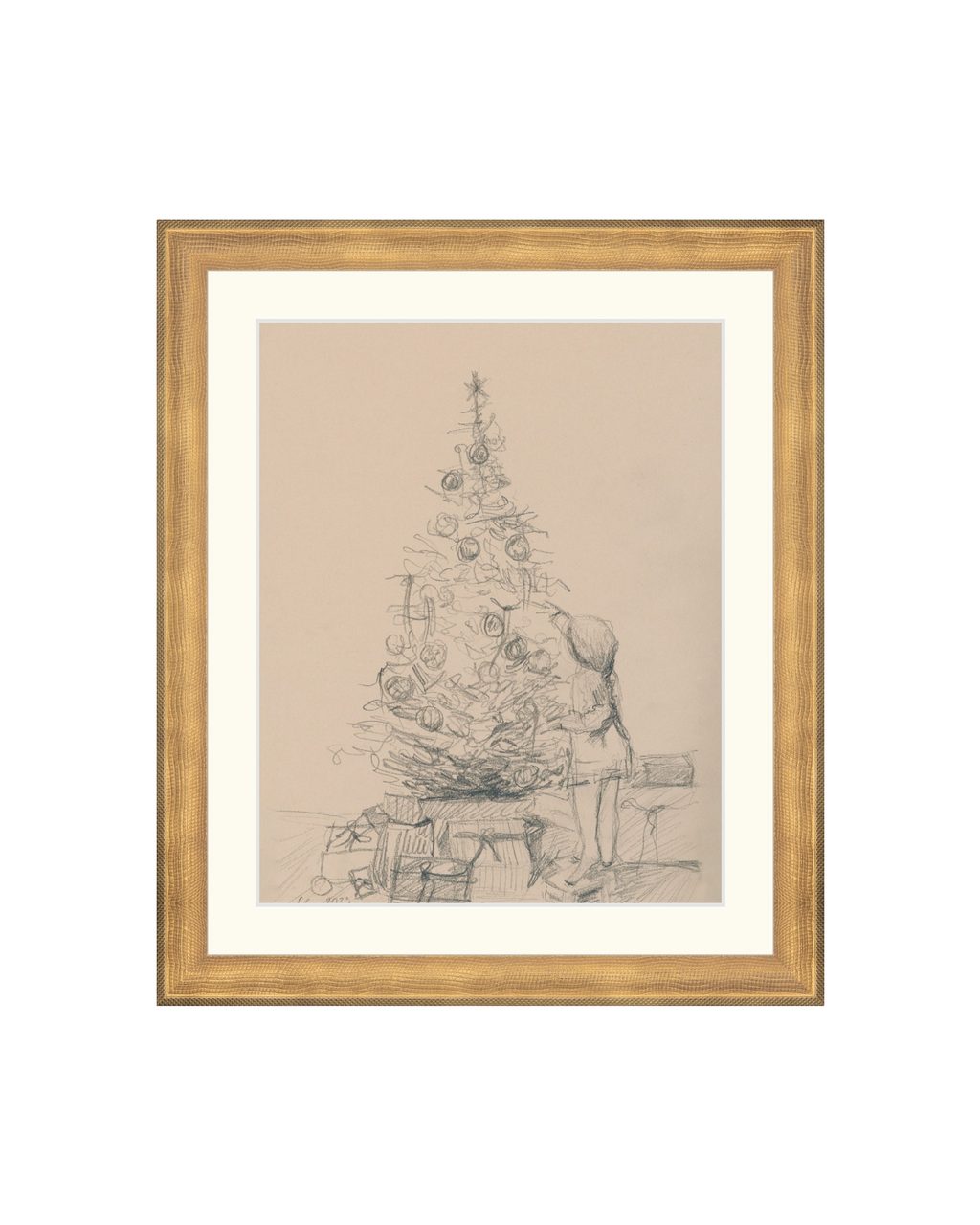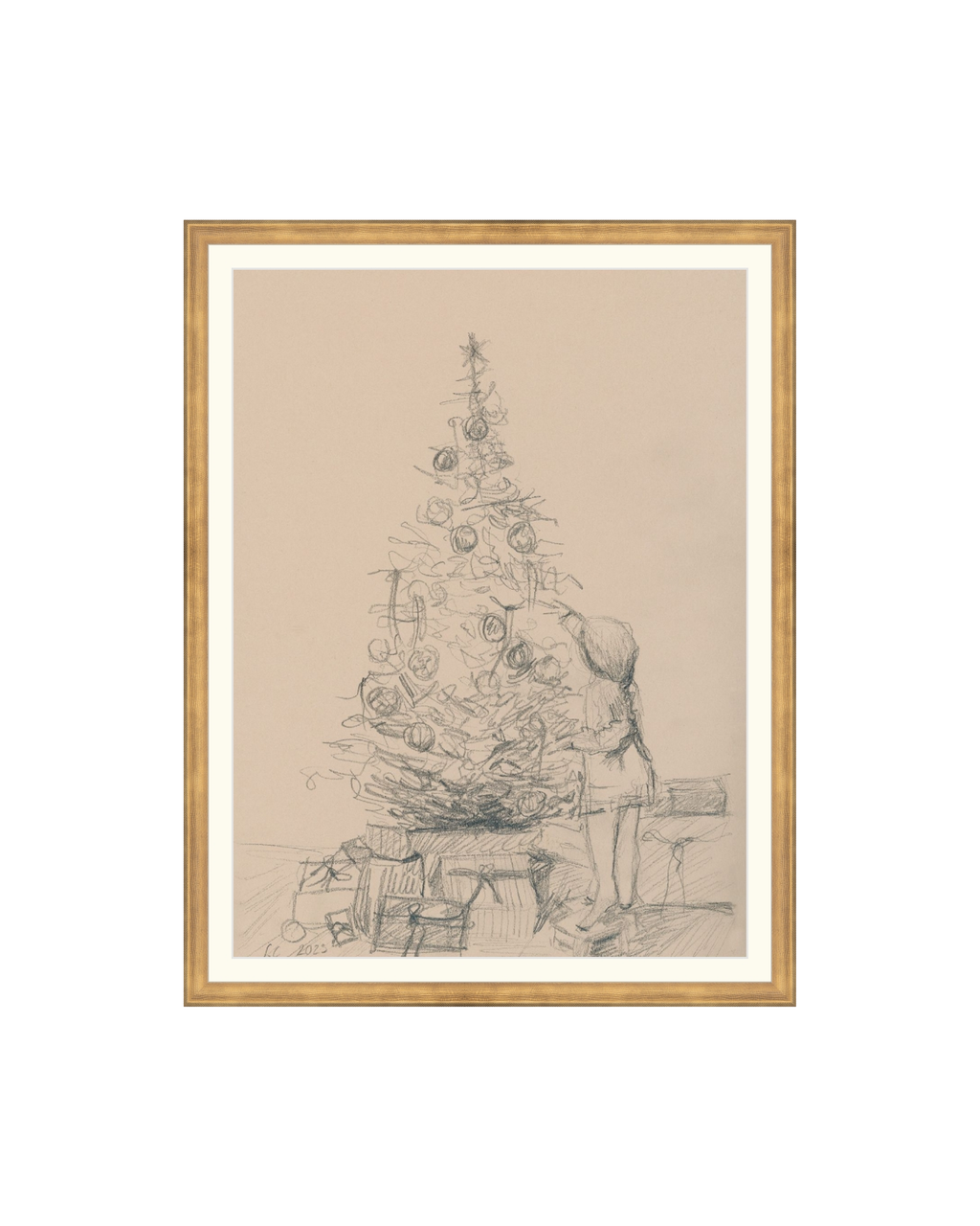 Print of a charcoal drawing by Lucia Chinaleong depicting a girl decorating a Christmas Tree.