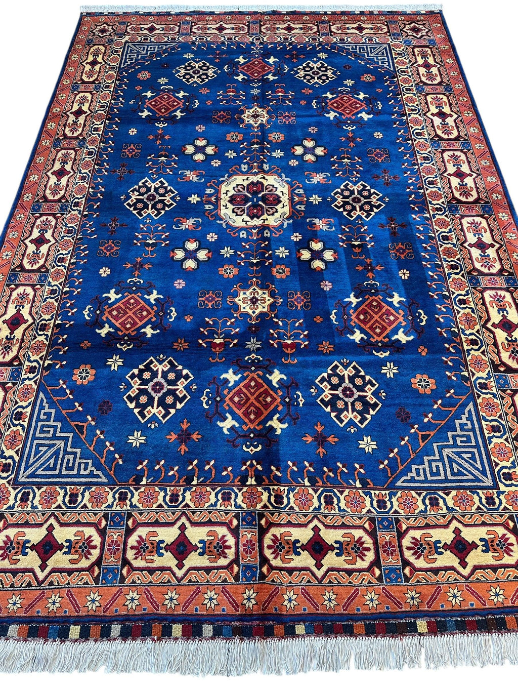 This stunning hand-knotted Afghan rug features an intricate geometric design in vibrant blue and earthy tones, crafted from 100% wool for exceptional quality and durability. With a thickness of 0.45", this rug offers both luxurious comfort and lasting resilience. Its bold patterns and premium craftsmanship make it a perfect centerpiece for any living space. Ideal for high-traffic areas, this rug combines elegance with practicality, bringing warmth and sophistication to your home.