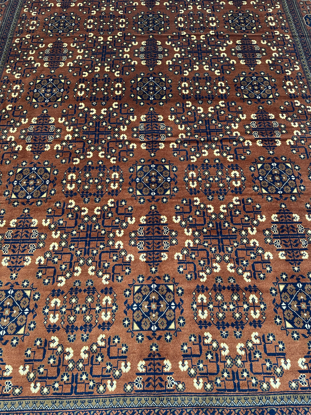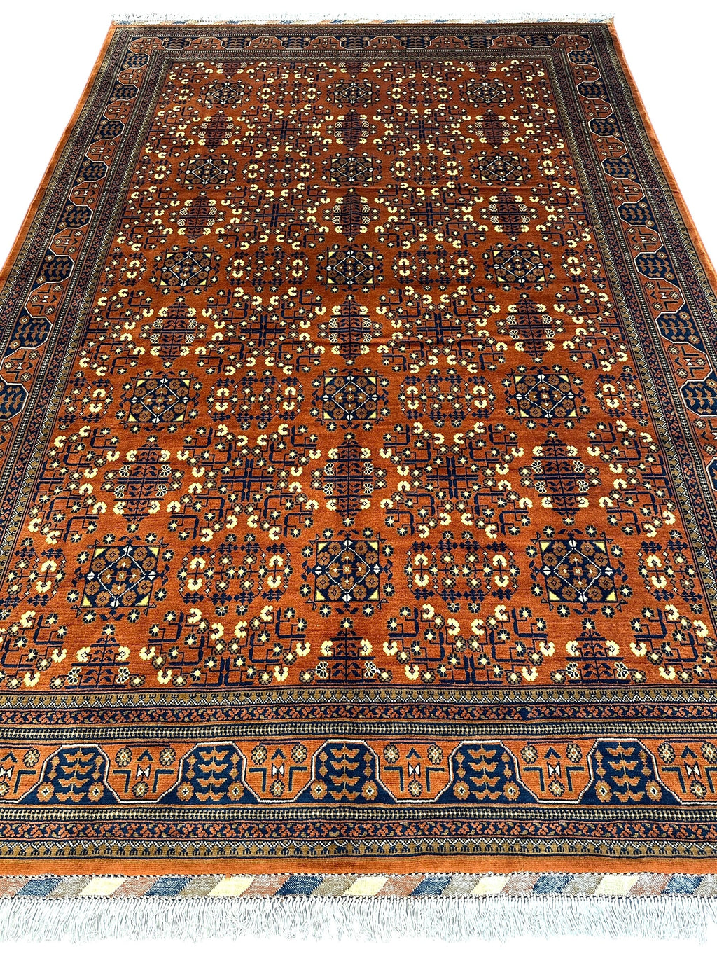 This hand-knotted Afghani Bukharayi rug blends centuries-old weaving traditions with a striking geometric patternthat radiates elegance and heritage. Woven in Afghanistan by master artisans, its design features repeating octagonal motifs in warm rust, navy, and gold-beige tones, framed by intricate borders that create balance and symmetry.