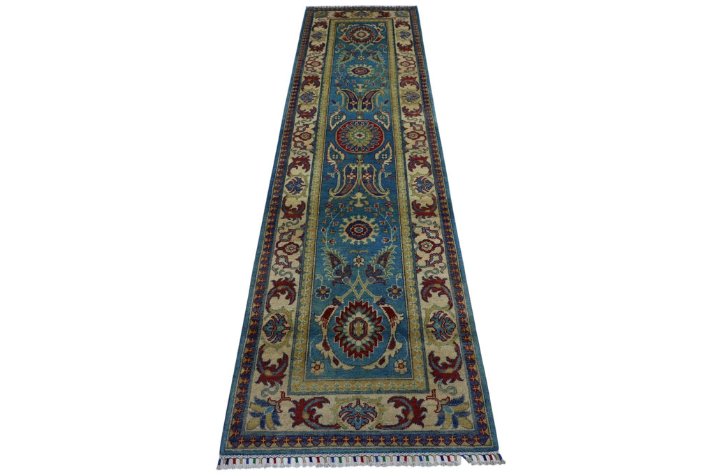 This hand-knotted kazak rug features rich color tones and traditional Afghan weaving. Made with high-quality wool on a cotton foundation, it offers both beauty and durability. Ideal for adding character and texture to entryways, living rooms, or studies.