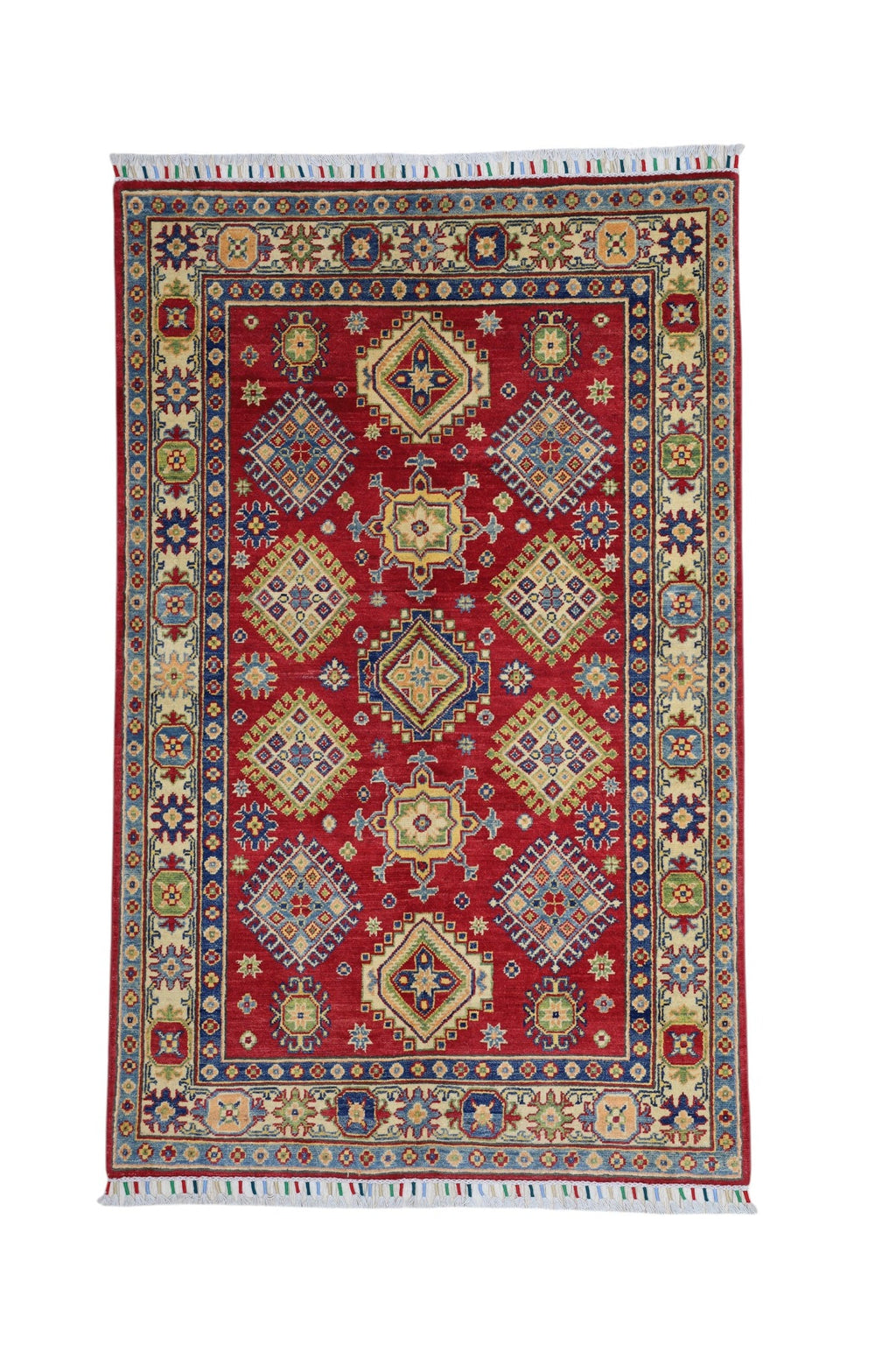 This hand-knotted kazak rug features rich color tones and traditional Afghan weaving. Made with high-quality wool on a cotton foundation, it offers both beauty and durability. Ideal for adding character and texture to entryways, living rooms, or studies.