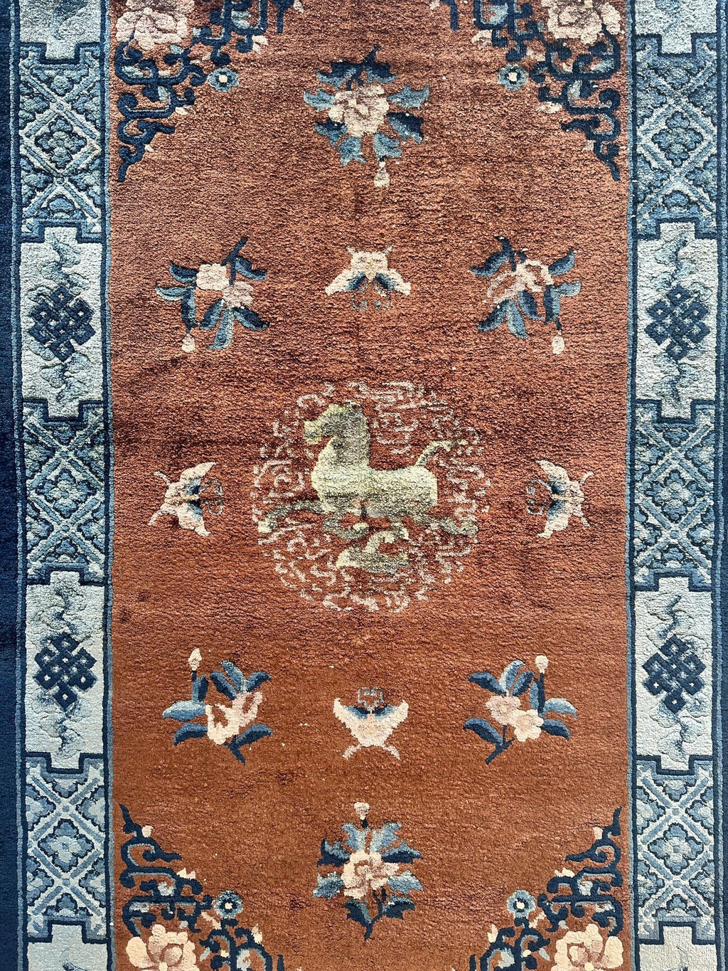 This exquisite hand-knotted Chinese Peking rug is crafted from 100% silk, featuring luxurious floral patterns and a soft, luminous texture. Perfect for adding elegance to living rooms, bedrooms, or studies, this 3’ x 5’ rug exemplifies timeless craftsmanship and artistic beauty. Its rich history and delicate design make it a true collector's piece.