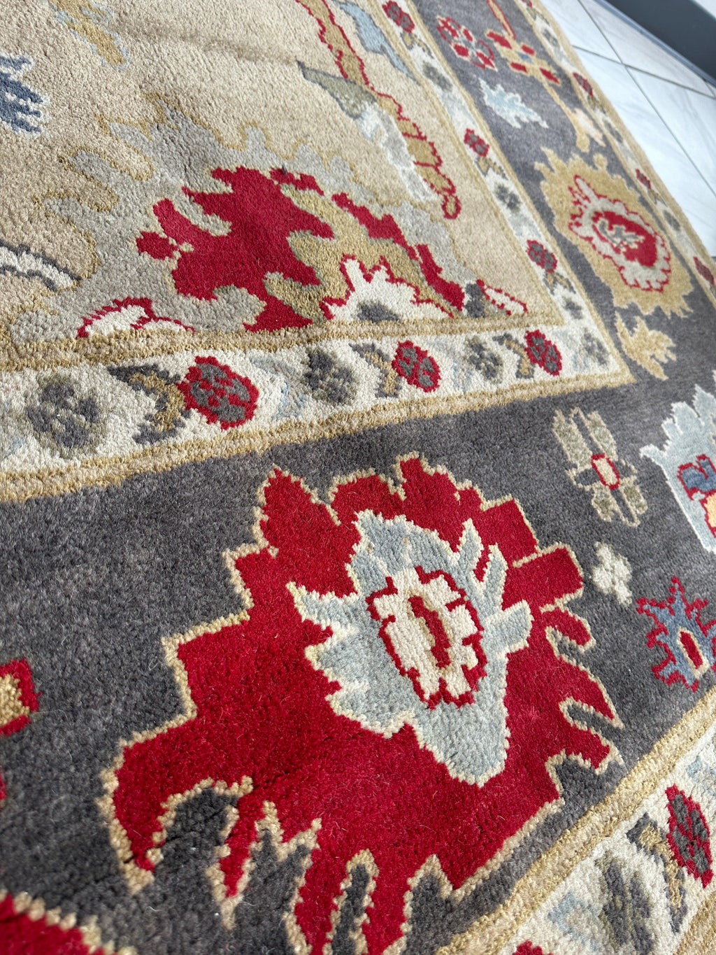 This stunning hand-knotted Oushak wool rug brings a touch of traditional elegance to any living room. The intricate design and full pile construction make this rug a luxurious addition to your home. Crafted in India, this 9x12 rug is expertly hand-made to ensure quality and durability.