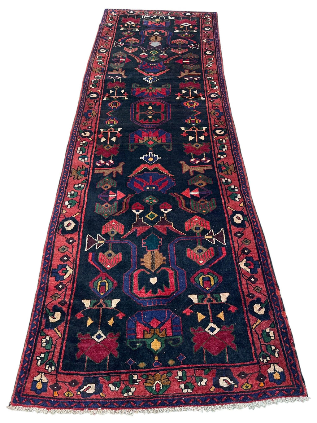This stunning Persian Tribal Hamadan runner is a timeless piece of craftsmanship, combining traditional artistry with exceptional durability. Hand-knotted by skilled artisans in the Hamadan region of Iran, the rug showcases bold geometric patterns and earthy tones that reflect the nomadic heritage of its makers. Its generous length and versatile design make it an ideal choice for hallways, entryways, or any narrow space that needs a touch of elegance.
