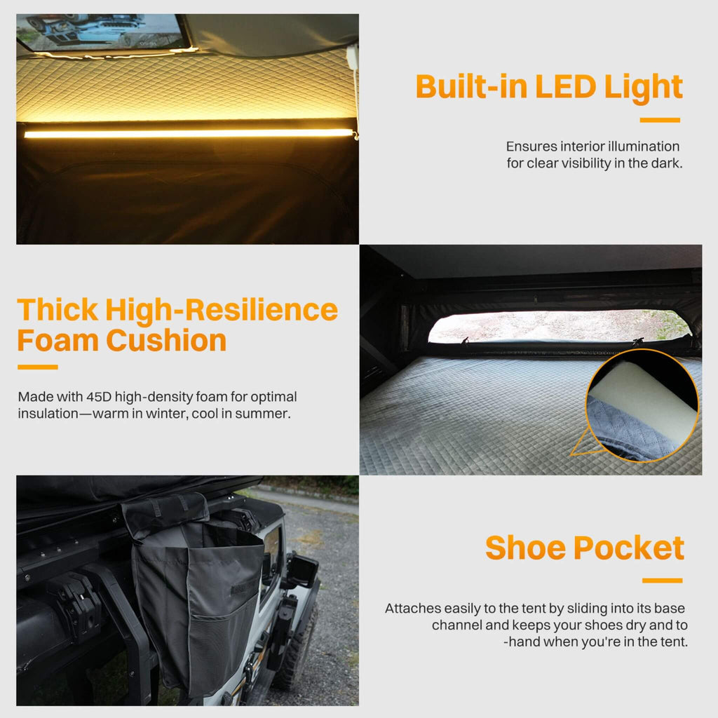 Elevate your next outdoor adventure with the Heavy Duty 2-3 Person Hardshell Rooftop Tent. Designed for those who crave comfort, durability, and convenience, this pop-up tent combines style and functionality in one sleek package. Its robust aluminum alloy shell and high-density Oxford fabric deliver ultimate durability, while the effortless 3-second setup makes embarking on your camping escapade stress-free. Perfect for couples or trios, this rooftop tent offers a spacious haven above ground, ensuring restful nights and unforgettable views under the stars. Whether you're exploring the wilderness or road-tripping in your favorite terrain, this tent transforms the way you experience the great outdoors.