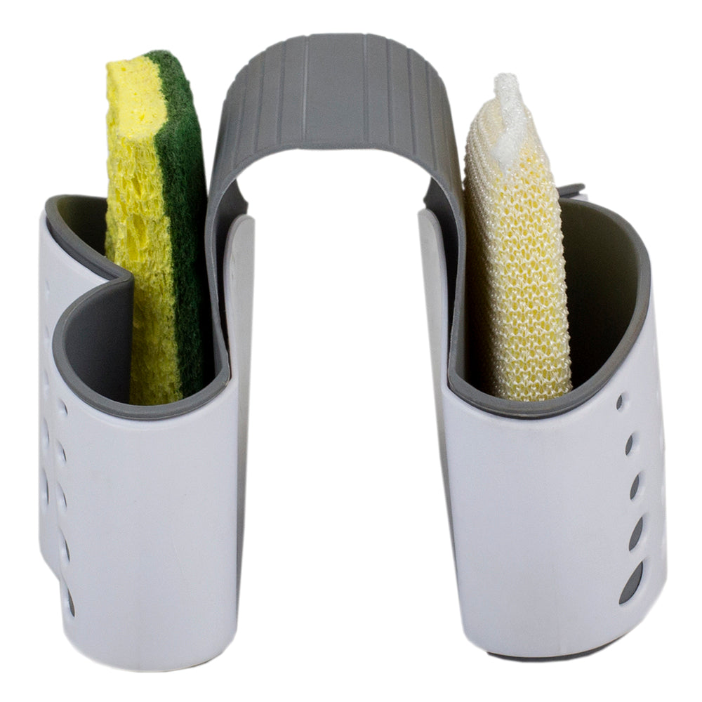A clever kitchen gadget, if you’re not a fan of sponges falling into the sink or propped on the counter where it can quickly accumulate bacteria. With no suction cups needed to keep it place, this dual sided sink caddy sits over the center of a double sink providing sanity storage for all your dishwashing tools. It features two sides with identical size compartments to hold regular size sponges with one small pocket on the other gr for holding a dish wand or brush. Holes along each side of the caddy allow water to drip directly into the sink ensuring everything dries and free of bacteria and mold.