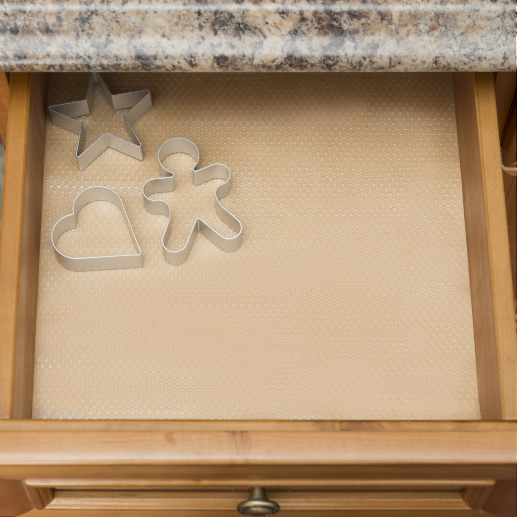 Whether you are looking to protect your drawers from dings and dents or looking to prevent crumbs and spills spewing over your surfaces, this rubber shelf is the perfect option for you! Features clear dotted design fits in perfectly with any kitchen decor. Use this liner on a variety of areas in your home including bathroom drawers, and kitchen pantries or cabinets, and tool boxes. It lies flat and is textured to ensure items remain in place. It measures 12x60 and can be cut or trimmed in any shape or form to easily customize to your unique space. You can wash kitchen drawer liners directly or wipe the mat with soap water and can be reused. MATERIAL: Rubber. SIZE: 12x60 Inches. COLOR: Clear