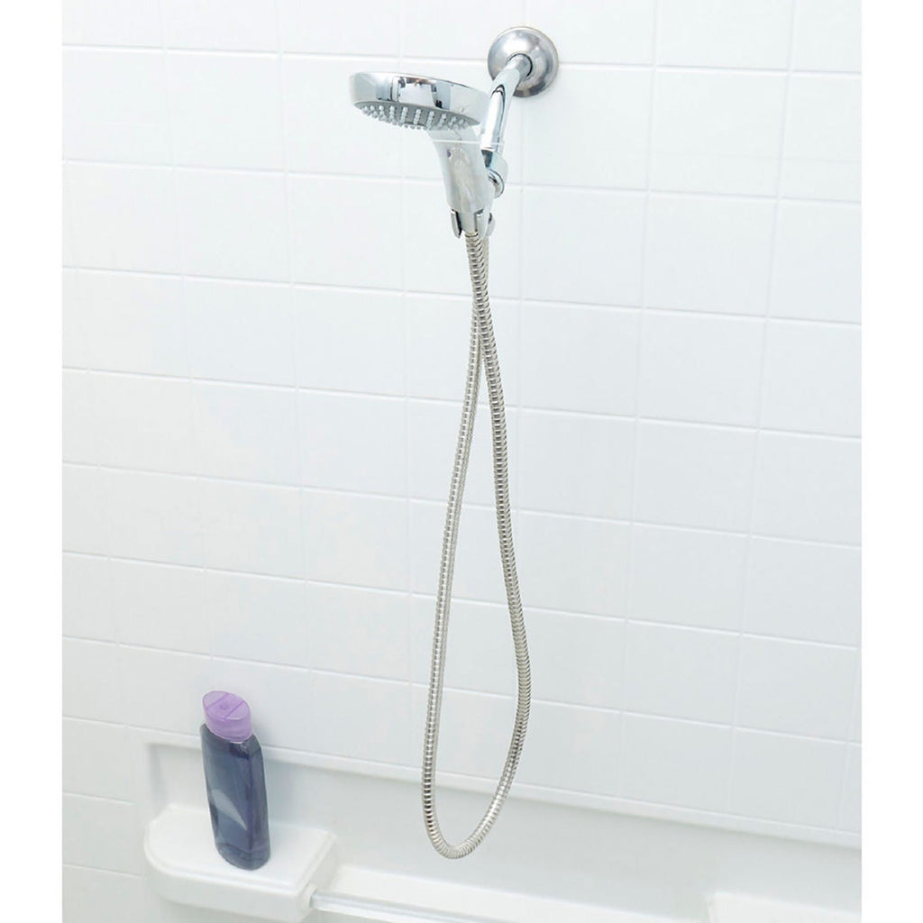 Elevate your shower experience with Home Basics' chrome massage single-function shower head that allows for a luxurious and soothing shower. Its chrome finish adds a touch of elegance to any bathroom while also being a practical choice for cleaning your bathtub or pets. The shower head is made from durable ABS and stainless steel and features rubber nozzles for even water distribution. It's easy to install without tools or drilling and comes with everything you need for a hassle-free experience, including a water hose, plumbers tape, bracket, and washers. With a flow rate of 2.26 GPM, this shower head is perfect for use in your master or guest bathroom.