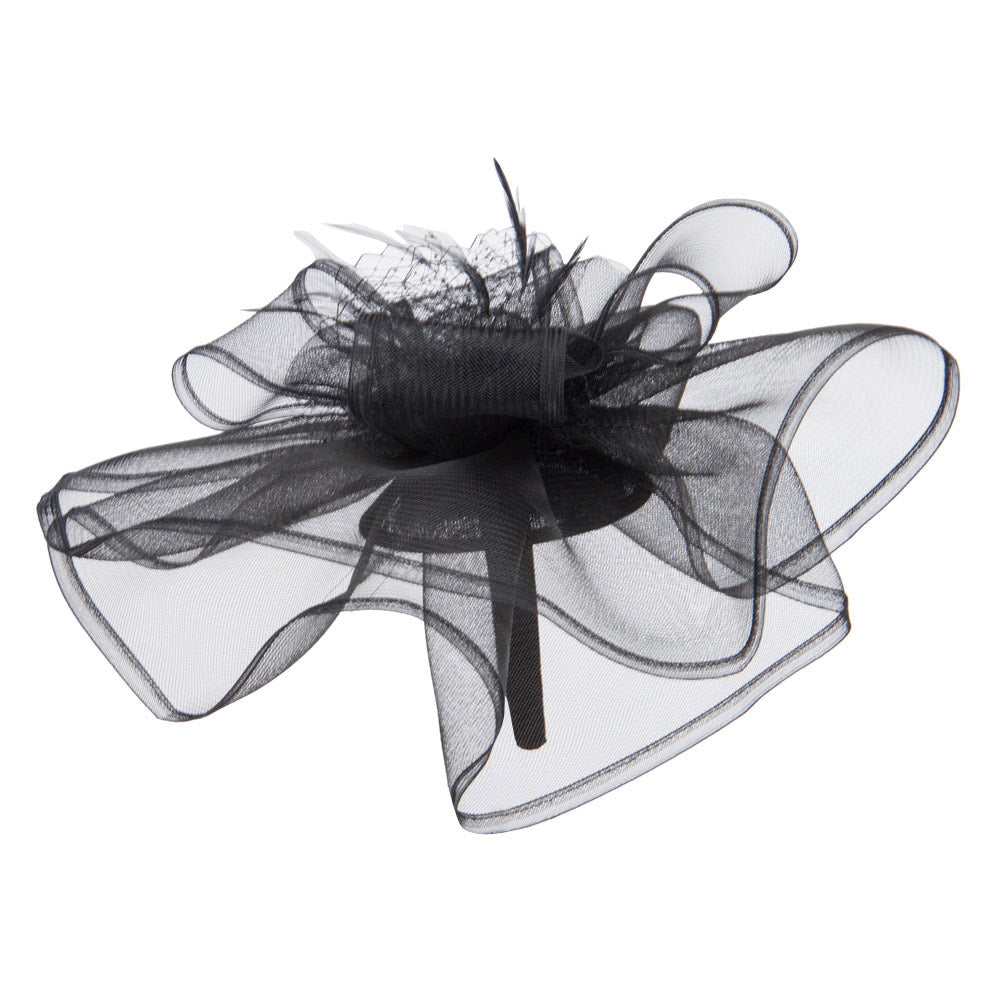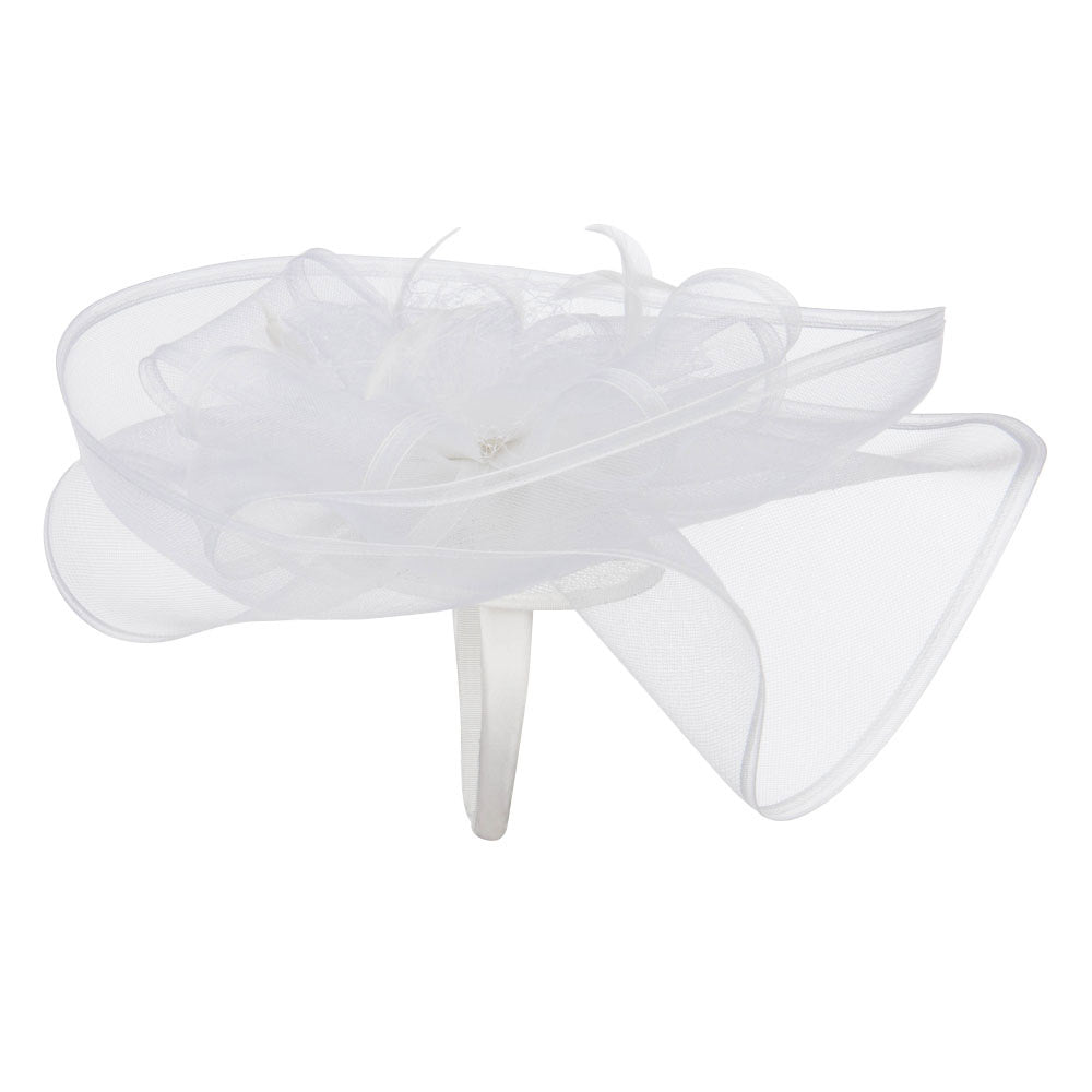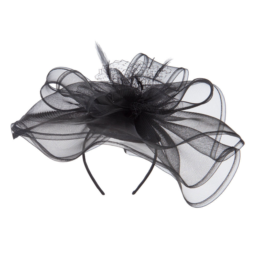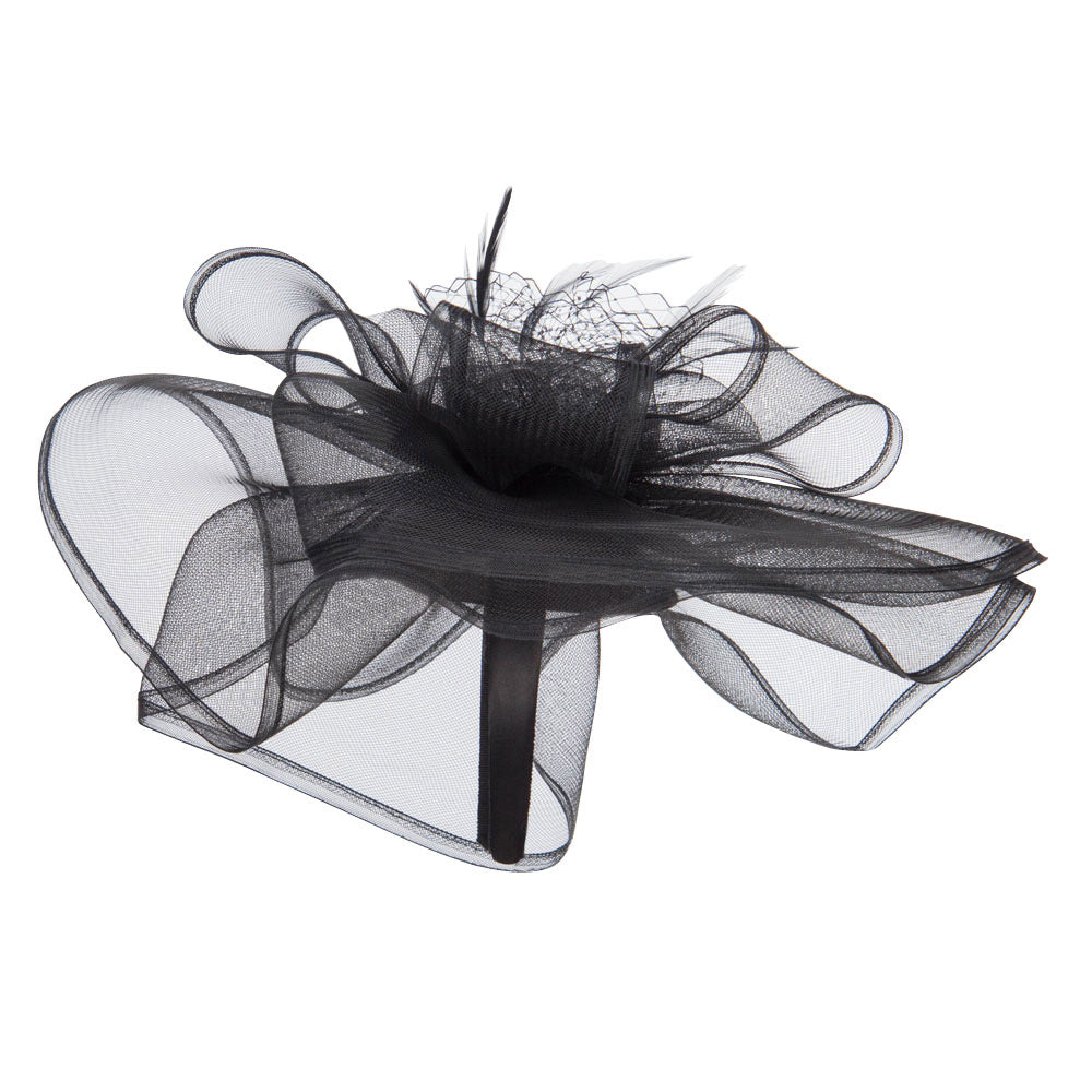 Design Features, Horsehair fascinator with flower, detailed with a net and feathers.