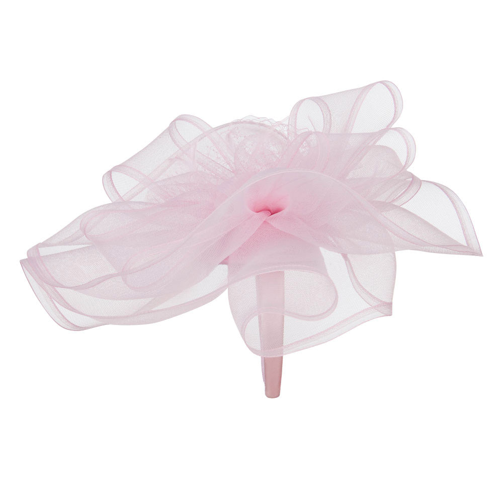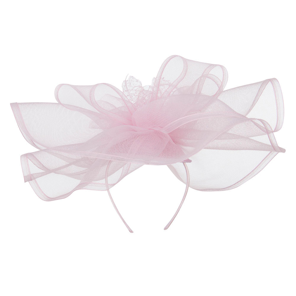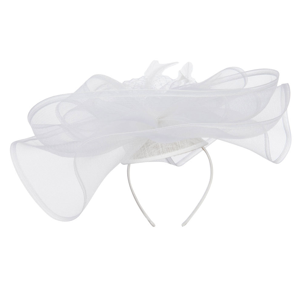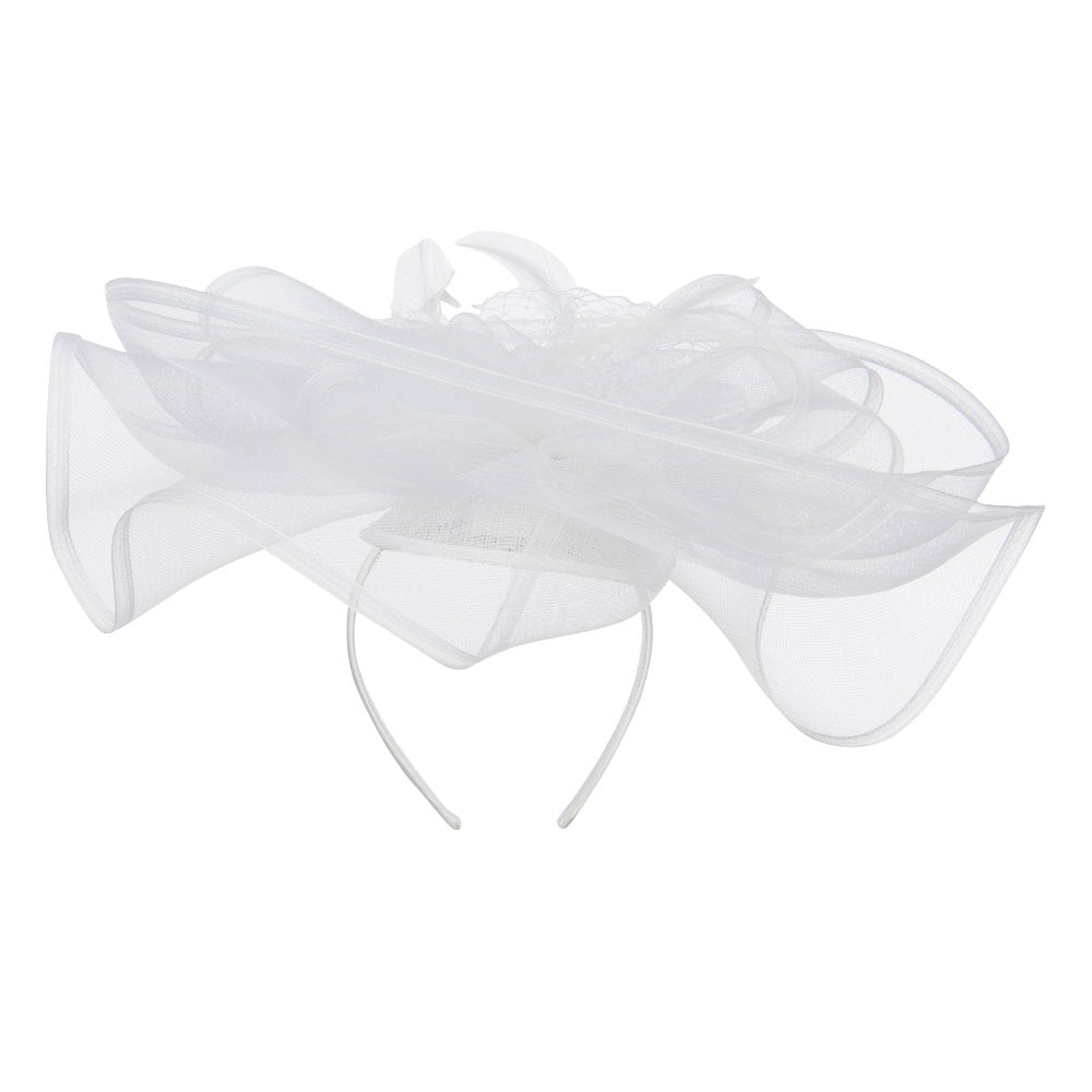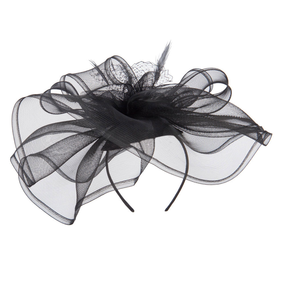 Design Features, Horsehair fascinator with flower, detailed with a net and feathers.