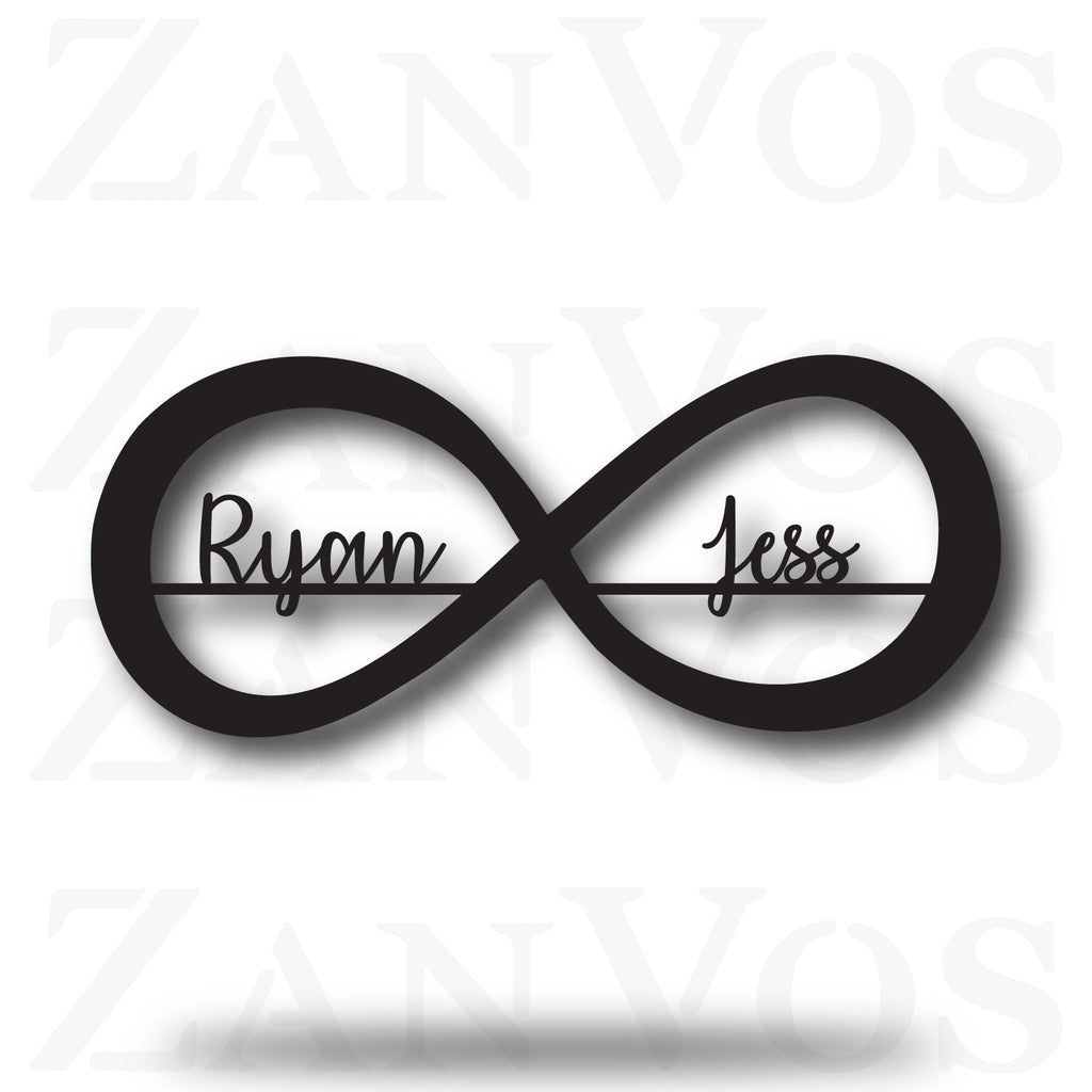 Made from durable 16 gauge steel with a powder-coated finish, the Infinity Monogram features a sleek infinity symbol accented by two lines of personalized text. This design symbolizes endless connection and adds a meaningful, custom touch to your space, combining strength with heartfelt sentiment.