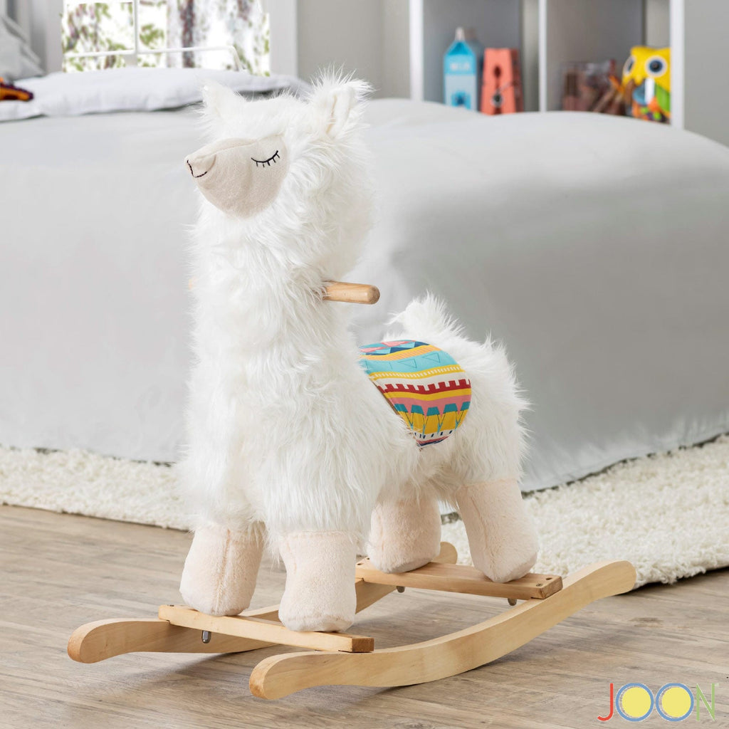Lola the Llama Rocking Horse is eager for a new home and tired of sitting in the mountain tops of Peru! Saddle up and take a ride on this incredibly adorable llama. Featuring a super soft stuffed body with a shaggy fur, dreamy eyes and a colorful vintage south American saddle. JOON’s Ride-On Rocking Horse Llama will have your child riding for hours while helping them to develop key motor skills and balance, along with fueling their imagination and creativity. Lola the Rocking Llama is soft and plush to the touch, and made with sturdy wooden handles and rocker base to ensure the safety of your child. Details include embroidered dreamy eyes, removable saddle, shaggy faux fur, a cute little tail, and lullaby sounds with the push of a button. Whether it’s roaming the grasslands of Peru or grazing among livestock, the adventures will never end! Durable enough to hand down from child to child, this will be a favorite for years to come. Also features fun lullaby sound effects, 2 AA batteries required (not Included).CARE: When it’s time to clean your new rocking horse, spot clean with a damp cloth only. COLOR: White with multi-color saddle. WEIGHT CAPACITY: 66 Pounds.