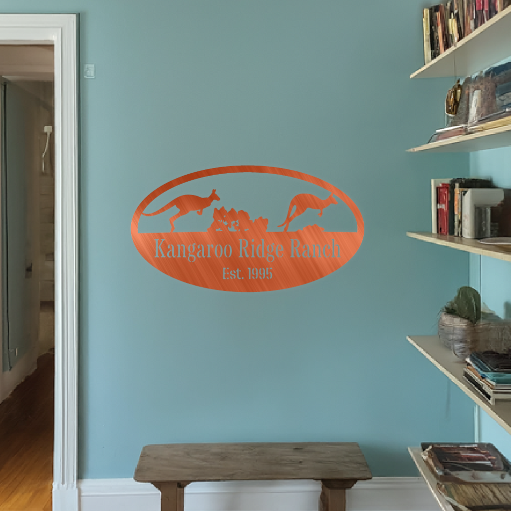 Personalize your space with our Kangaroo Monogram! Made from durable 16 gauge steel, this powder coated monogram features a playful kangaroo design and allows for two lines of personalized text. Create a unique and personalized touch to your home or office.