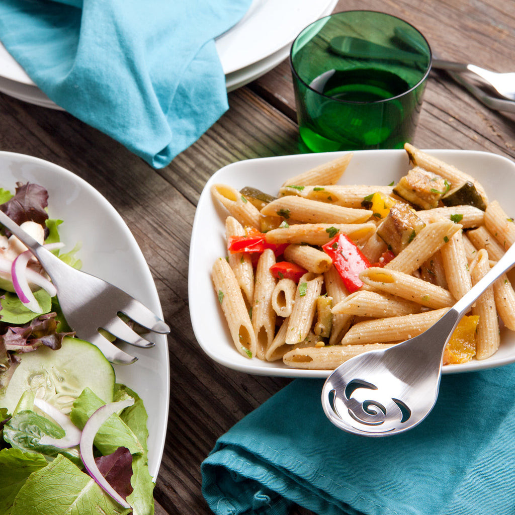 Simple and striking, this satin serving set will complement your Knork dining set. This set includes a Serving Knork, a Serving Spoon, a Slotted Spoon, a Butter Knife, and a Sugar Spoon.