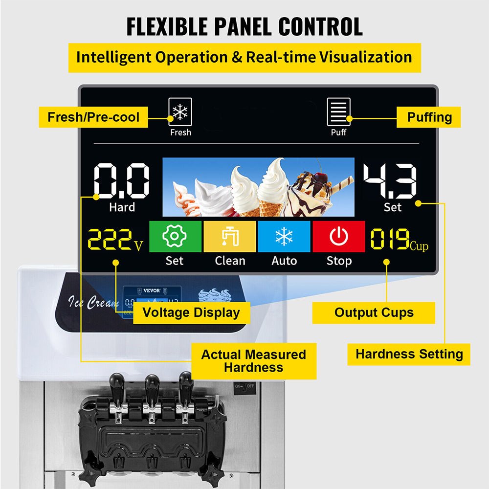 • Driven by a 2200-watt brand compressor, this commercial ice cream maker has faster cooling, less noise, and lower power consumption. R410a refrigerant makes ice cream production more efficient and energy-saving, allowing you to not worry about soaring electricity bills while making the soft ice cream.