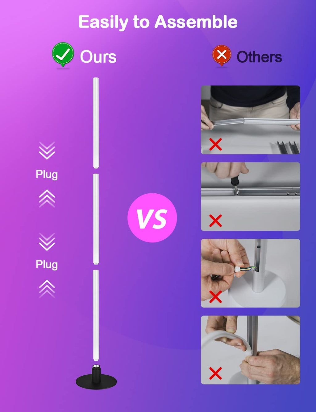 This new corner lamp is so easy to assemble! No complicated steps - just plug it in and you're done. You can finish the whole process in less than a minute, following the simple instruction guide. This lamp is perfect for any room, and its sleek new design will complement any style. Plus, it's easy to move around if you need to change up your space.