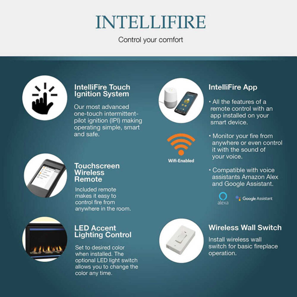 • The IntelliFire Touch® system provides easy control with a touchscreen remote or wireless wall switch, and additional options like a Wi-Fi module for app control.