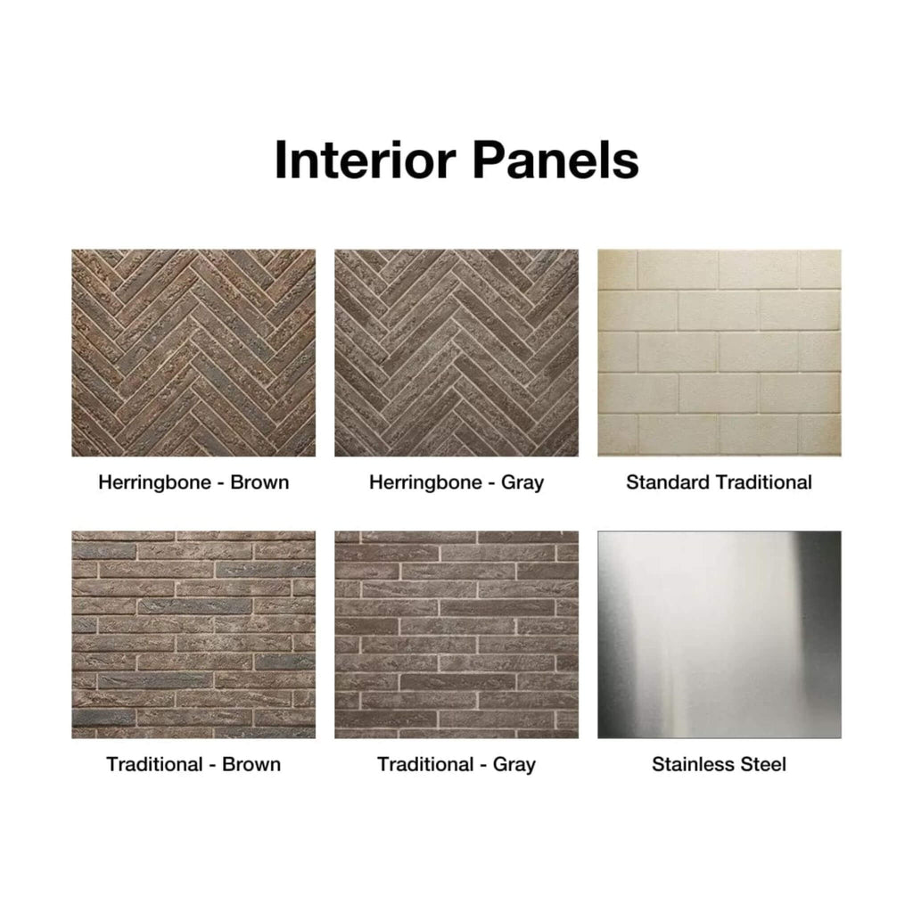 - Tailor the look of your fireplace with interior options that suit your taste. Choose from sleek stainless steel or classic brick panels in traditional or herringbone patterns to create the perfect ambiance for your outdoor space.