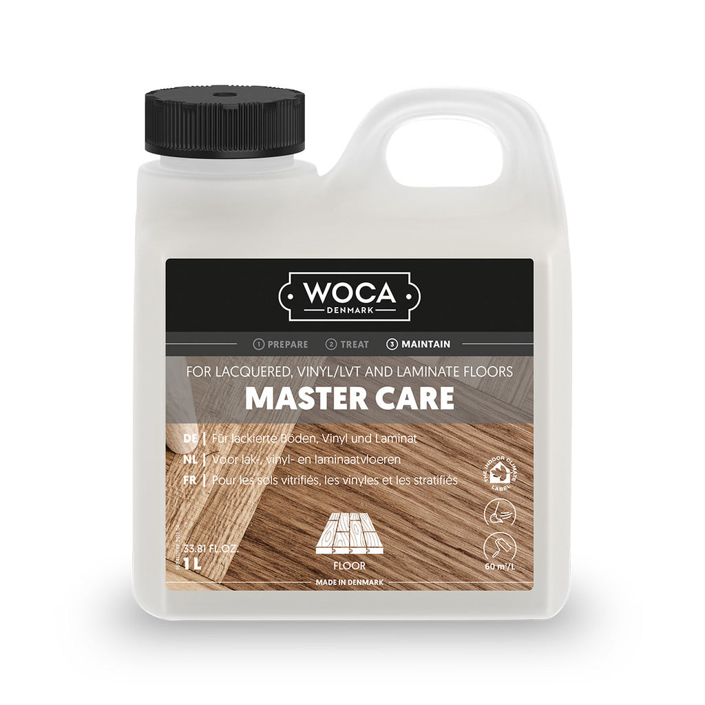 WOCA Master Care is suitable for water based finish, polyurethane, laminate, LVT and vinyl surfaces. It strengthens the surface as it protects against wear and tear. Prolonging the life of the finished surface.