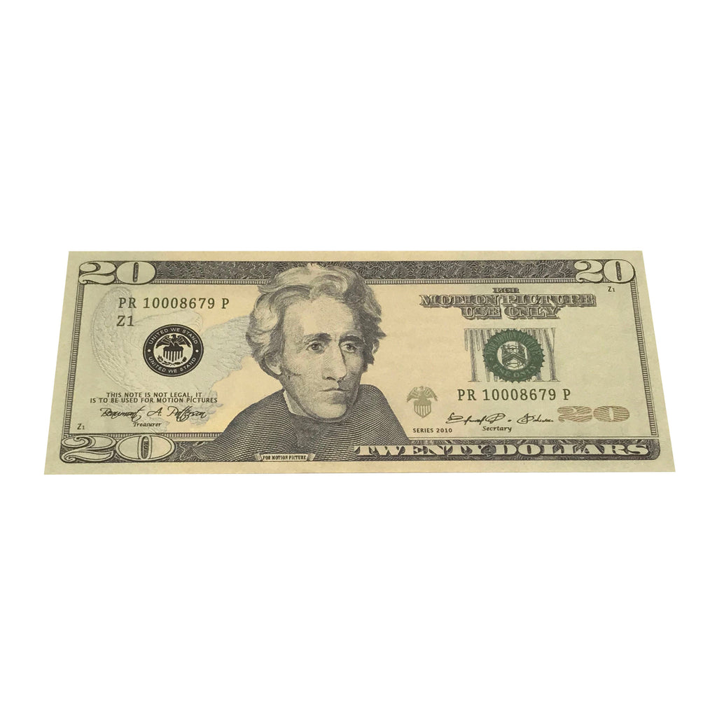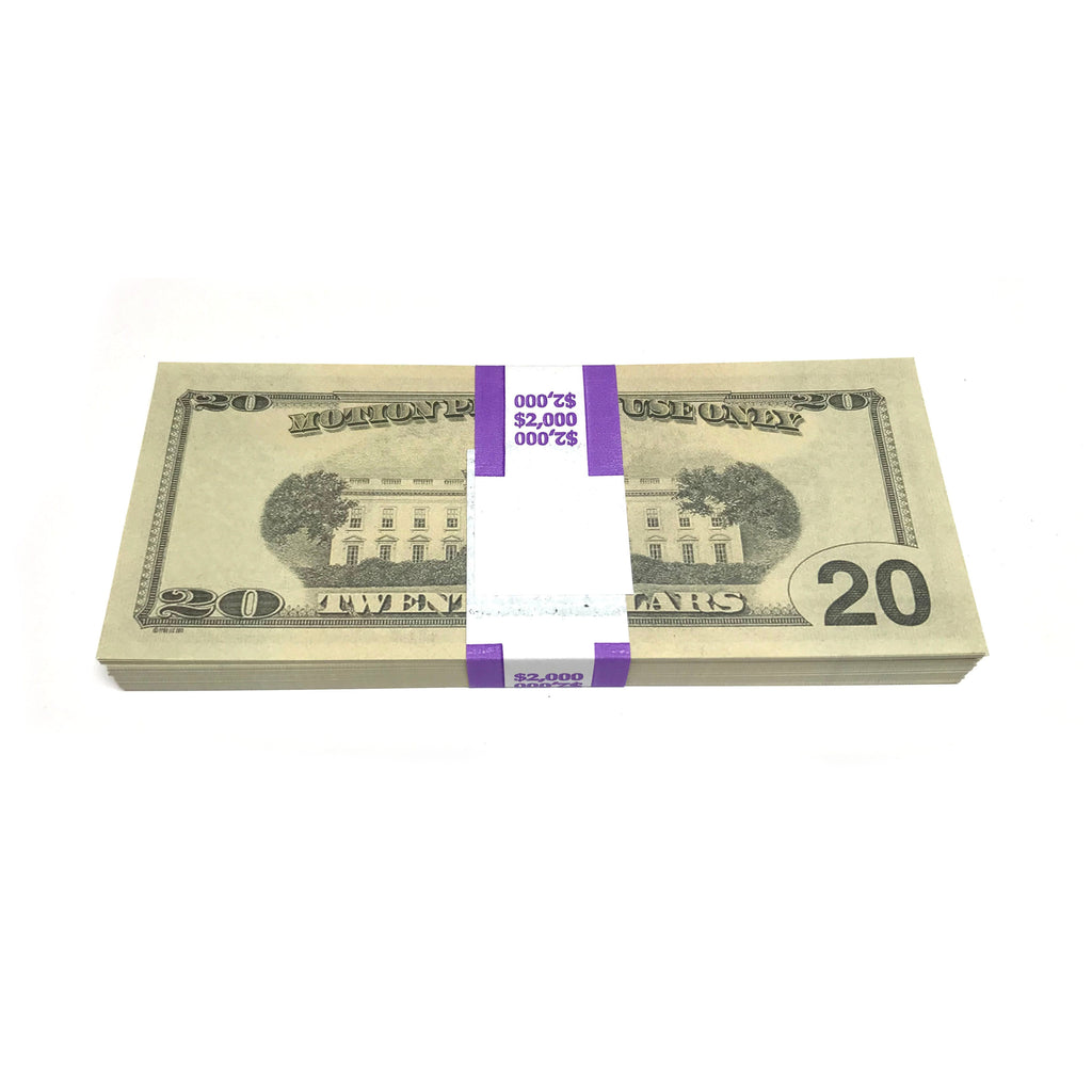 This is a crisp new $20 dollar bill stack that would equal $2,000 in fake cash. Each item features (100) pieces with 2-sided full color printed in the New Style $20 bills. Each stack comes with a removable $2,000 bank band. No blank filler sheets. Stunning detail and quality. Professionally printed and cut. These are made by the leading producer of motion picture prop money.