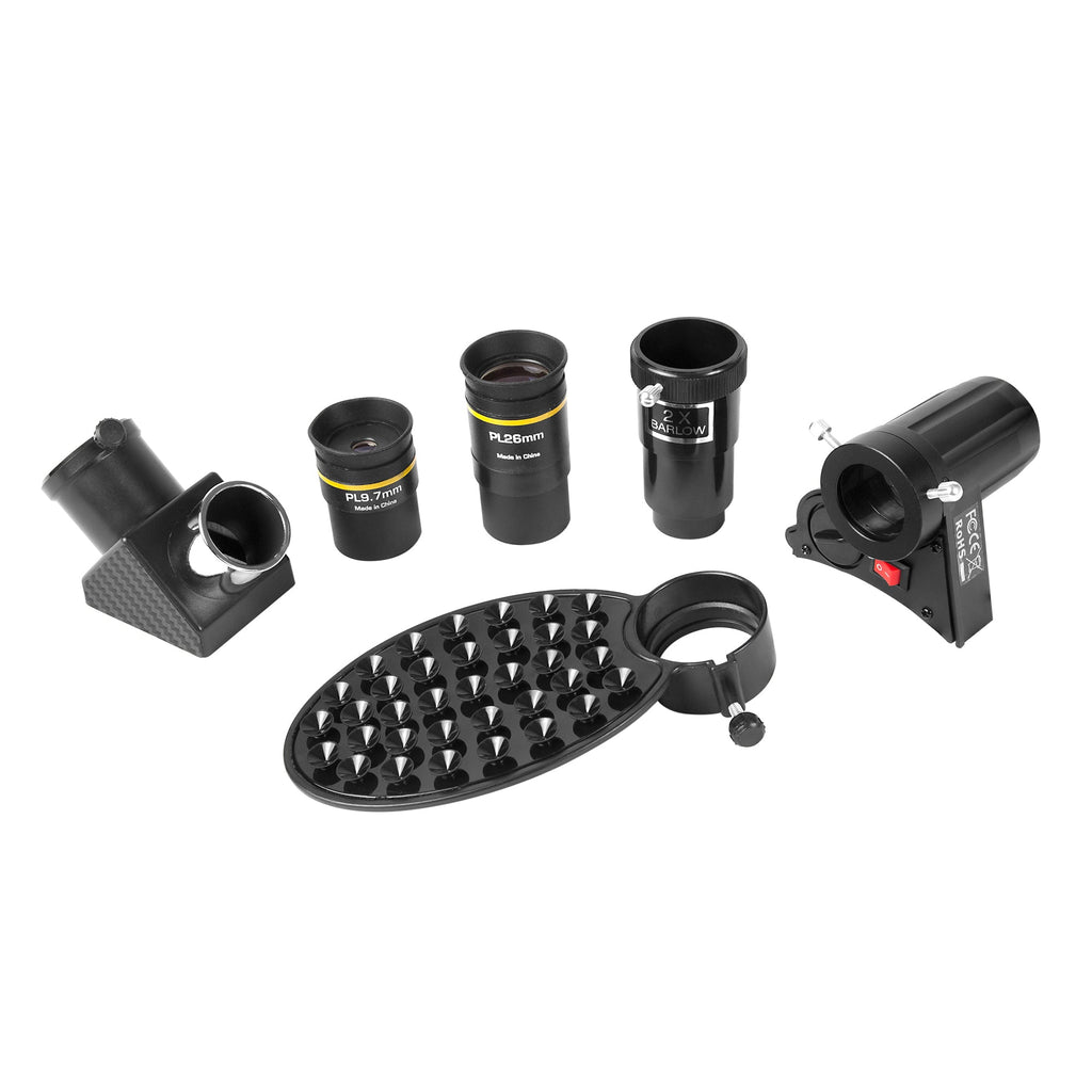 Explore the night sky with confidence using the National Geographic 70mm Refractor Telescope — a beginner-friendly telescope with impressive optical power and smart features for both visual observation and smartphone photography. Its 70mm aperture captures detailed views of the Moon’s craters, Saturn’s rings, Jupiter’s cloud bands, and even bright deep-sky objects. The optical tube's sleek carbon fiber styling adds durability without extra weight, making it perfect for home use or travel. Equipped with two Plössl eyepieces and a 2x Barlow lens, this telescope offers magnification from 26.9x to 144x, giving you the flexibility to observe both wide star fields and zoom in on specific celestial features. Smooth pan-and-tilt movement from the alt-azimuth mount makes navigating the sky intuitive, while the included red dot finder and downloadable astronomy software help you locate your targets. For aspiring astrophotographers, the included smartphone adapter allows you to easily capture and share your discoveries. With a full-size, adjustable tripod and a built-in accessory tray, this telescope delivers a stable, complete setup for every starry night.