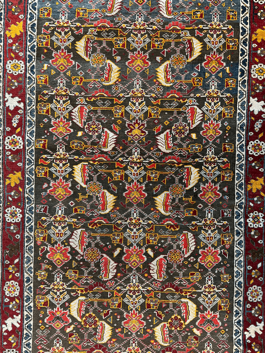 A rare thin Kashuli (sub-tribe of Qashqai) rug with low eve pile throughout.