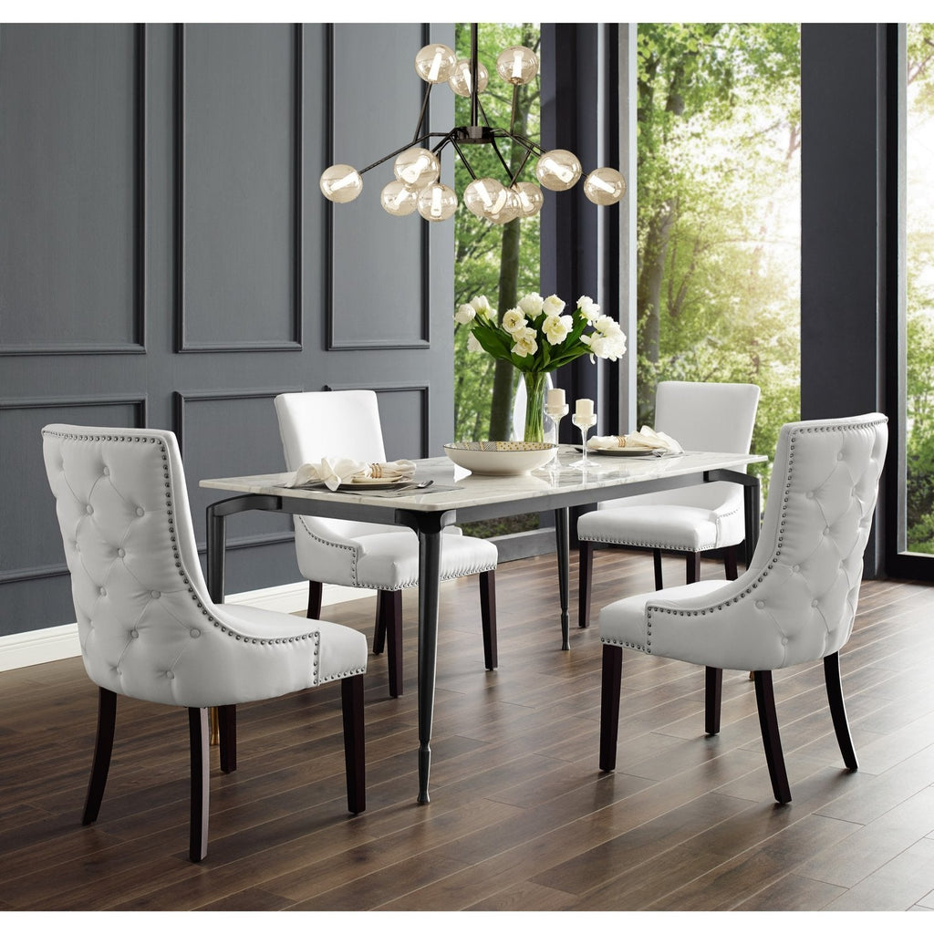 • SET OF 2 - Sold as a set of 2 matching chairs. Pair it with any dining table to add a luxurious and elegant look. Designed to dress up any dining space, this set of two chairs features leather PU, velvet or linen upholstery in a choice of color.