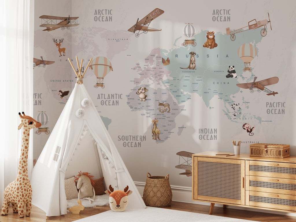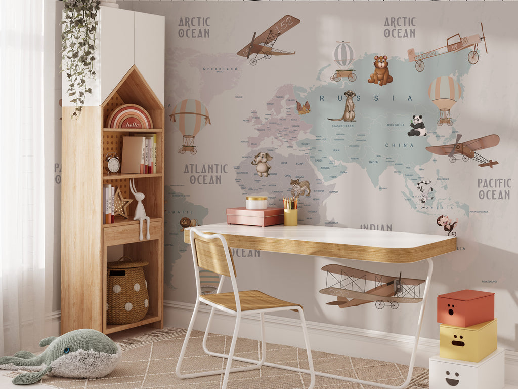 Explore the world with Peel and Stick World Map Wallpaper for Kids. This colorful and fun map is designed to be educational for children, encouraging them to learn about the geography of the world. Easily to install wallpaper with no fuss — just peel and stick! Perfect for young parents looking to create an interesting room for their kids.