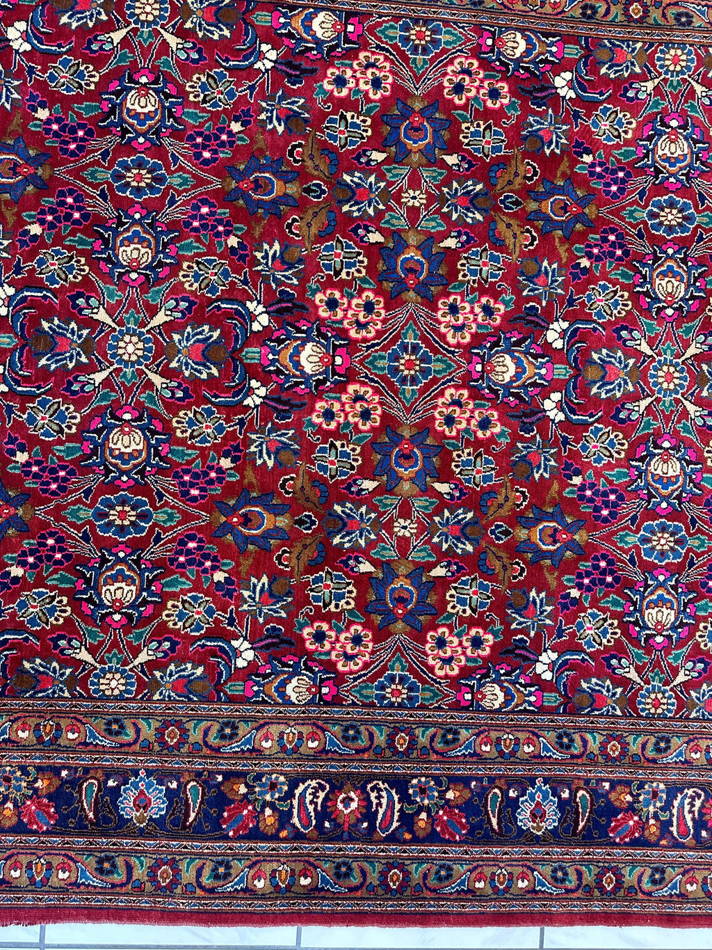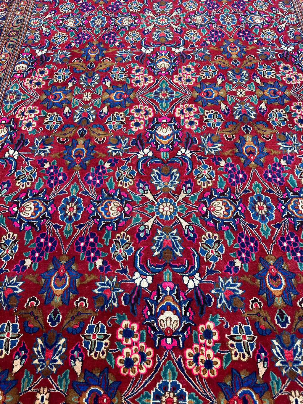 This beautiful Persian Mashhad rug features intricate hand-knotted construction, making it a vintage piece of art. Made from wool with cotton warp, it showcases a stunning Mashhad design. Mashhad is one of the biggest cities of Iran and Persia. Mashhad carpets are known to be robust and enduring. A genuine Persian carpet like this one requires a lot of skill and experience. Generally, it takes several months to craft such a carpet by hand in traditional handicraft. With its size of 6'11”x10’4”, this pre-loved rug is in great condition and adds a touch of luxury to any space. Hand-made in Iran, it exudes passion and craftsmanship.