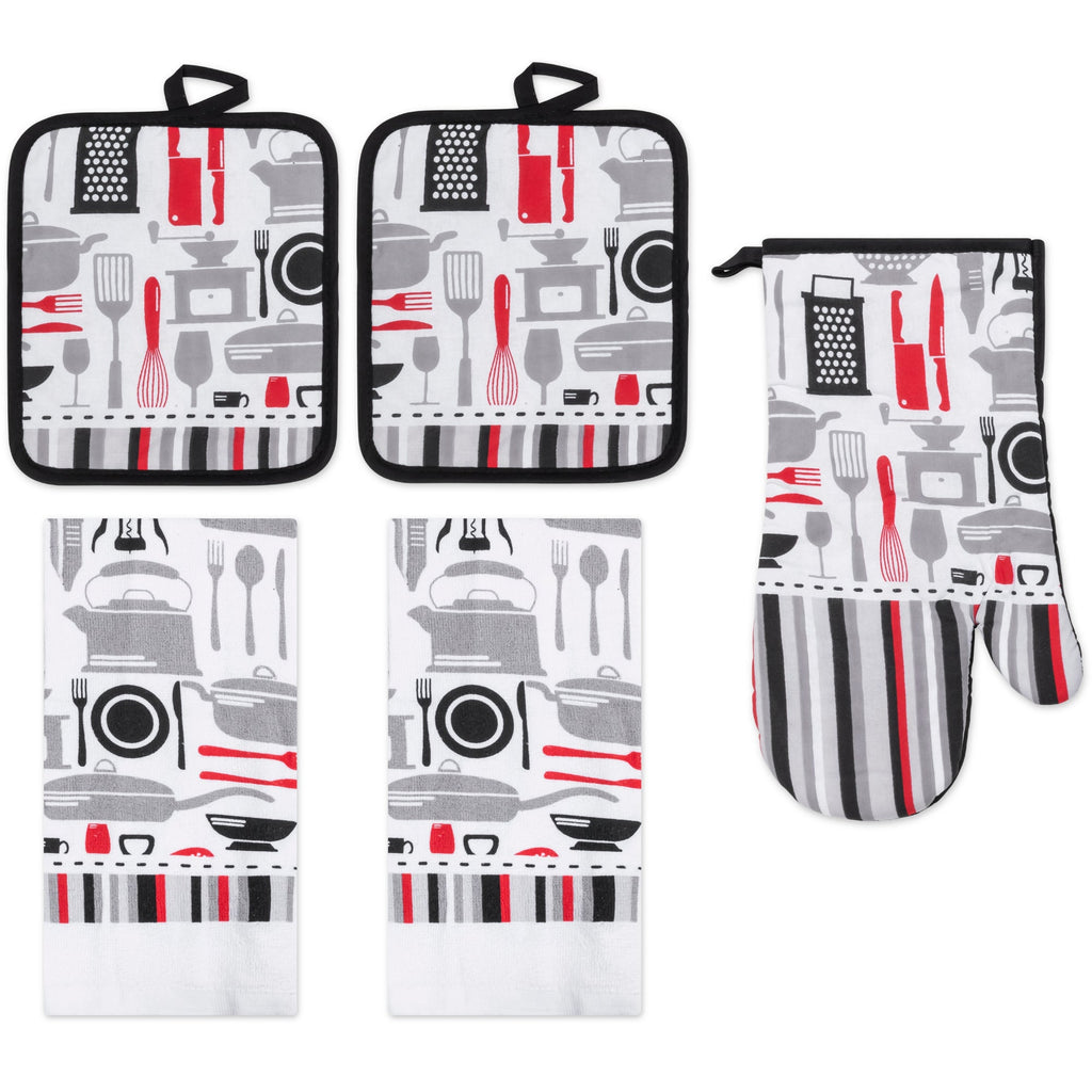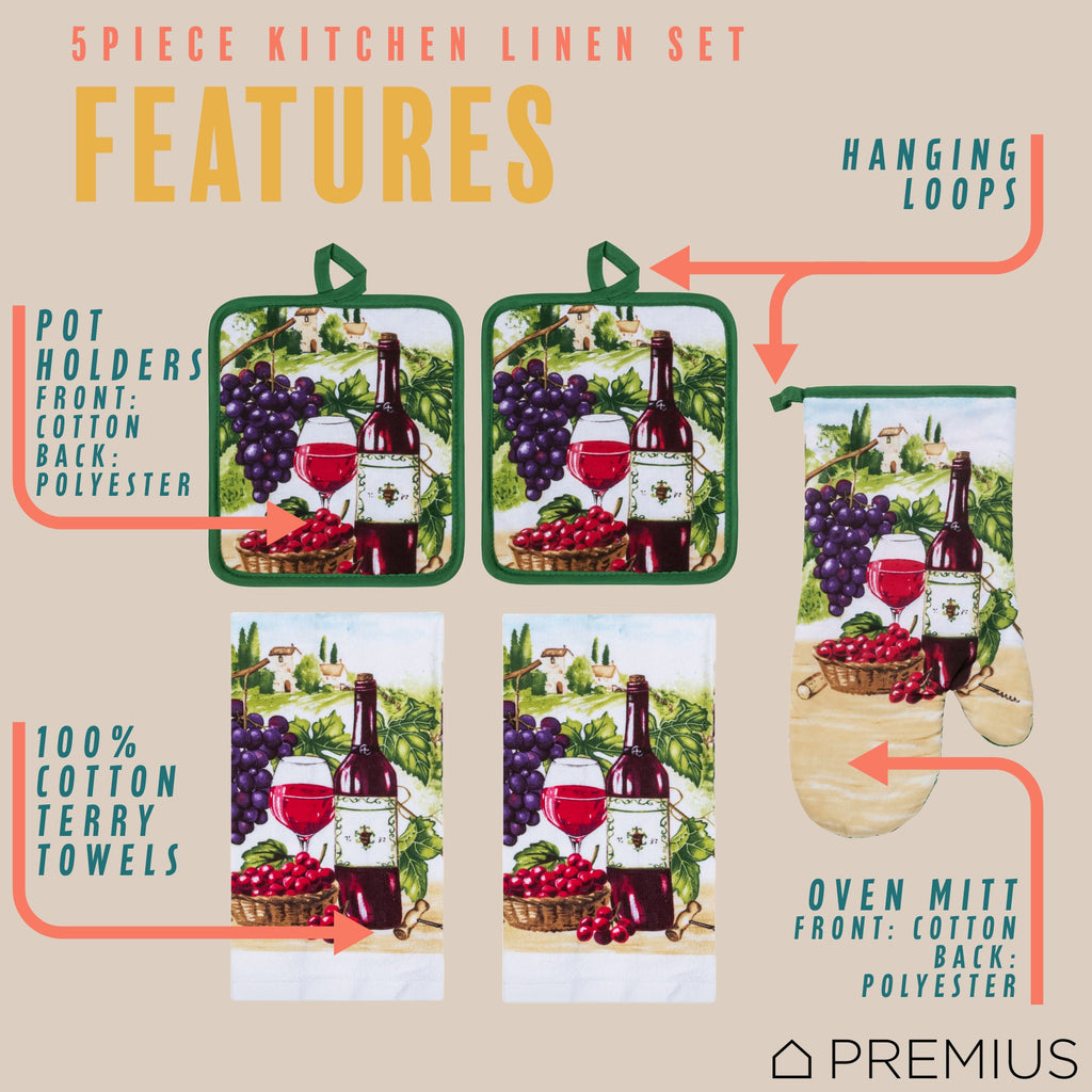 PREMIUS 5 Piece Printed Kitchen Linen Set, 2 Cotton Towels, 2 Pot Holders, 1 Oven Mitt