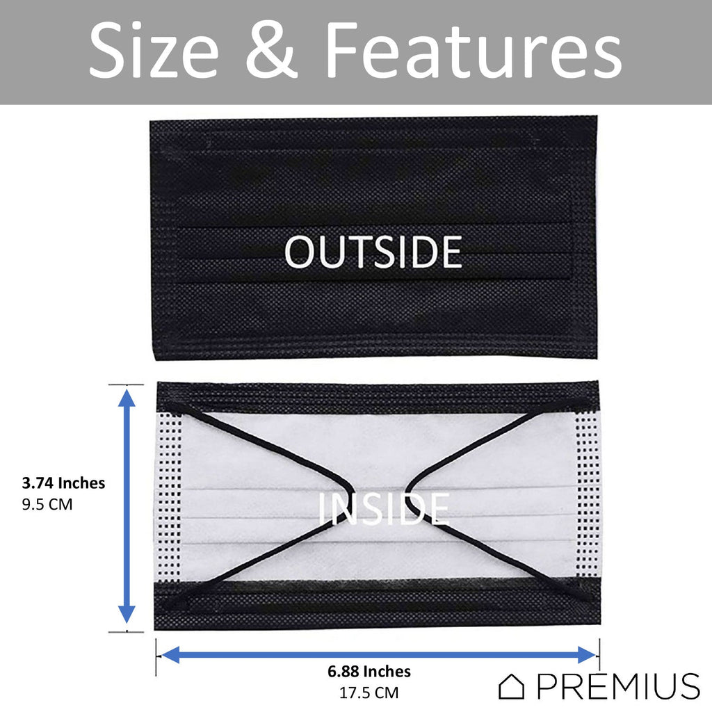 Premius 50-Piece Disposable Face Masks features 3 layers of professional melt blown cloth for optimum protection against dust, pollen, pollutants, and unwanted bacteria. Constructed from soft materials to protect against irritation and scratching, these masks are highly breathable, and will allow you to communicate easily without raising your voice. As you go about your day, you may even forget you are wearing a mask! Not to be used twice. Made of strong and durable fabric, these masks provide a comfortable breathing experience as they are soft, skin-friendly, and easy to use. The extra soft elastic ear loops stretch to gently rest behind the ear, providing a secure hold while the flexible built-in plastic nose band adjusts to conform to the face, providing needed safety barrier on faces of all shapes. Full coverage from the bridge of the nose to the jaw and chin. Suitable and applicable for every setting such as gardening, construction, nail salons, medical, dental uses, and people with allergies. These masks also have a metal wire for snug fit around the nose. Wear with blue lining on the outside. CONTENTS: 50 Count. COLOR: Black.