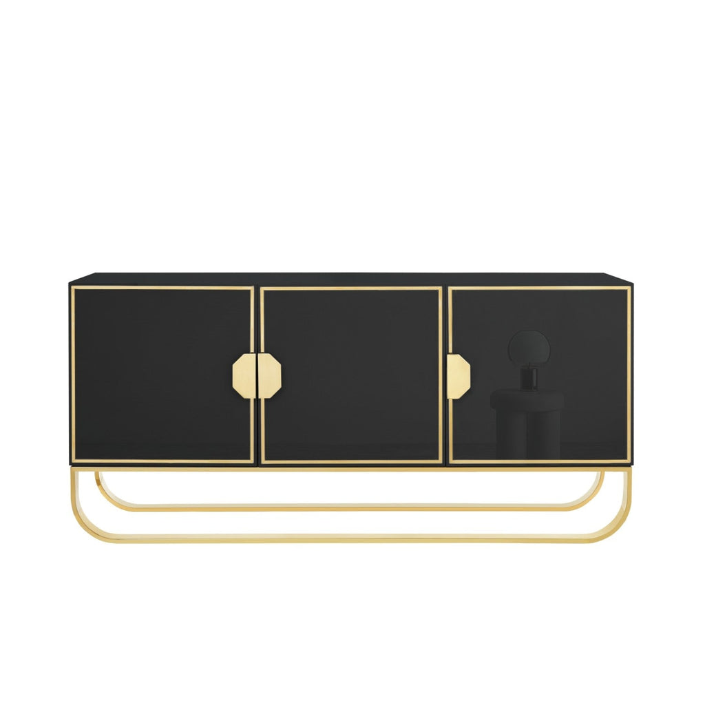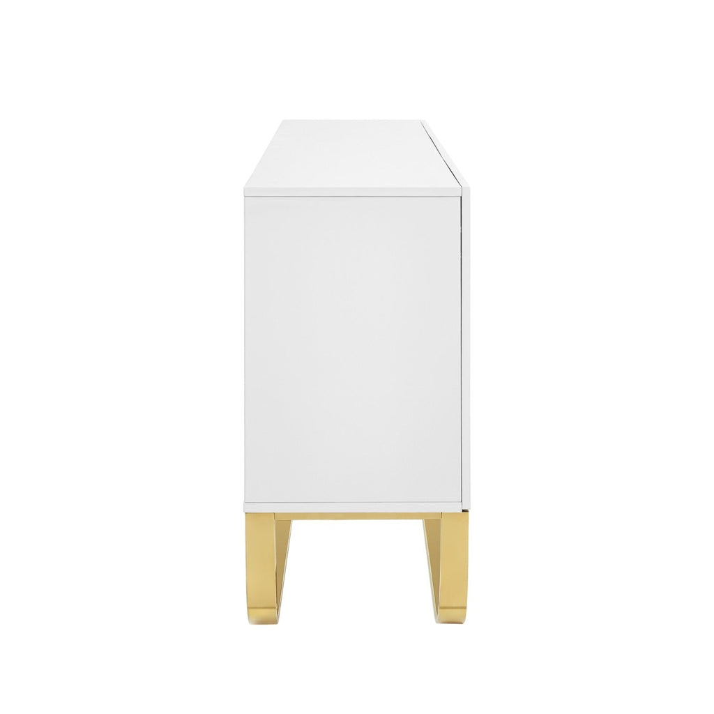 This simple, but modernist sideboard cabinet with a high gloss finish makes a statement in any living room, dining room, office or entryway, adding a contemporary flair to your décor. The cabinet is made of manufactured wood and MDF with stainless steel handles and a rounded frame in chrome or gold finishes, making it highly appealing. It has three doors that open to expose compartments for storing various goods, giving it a modern look and being very functional at the same time.