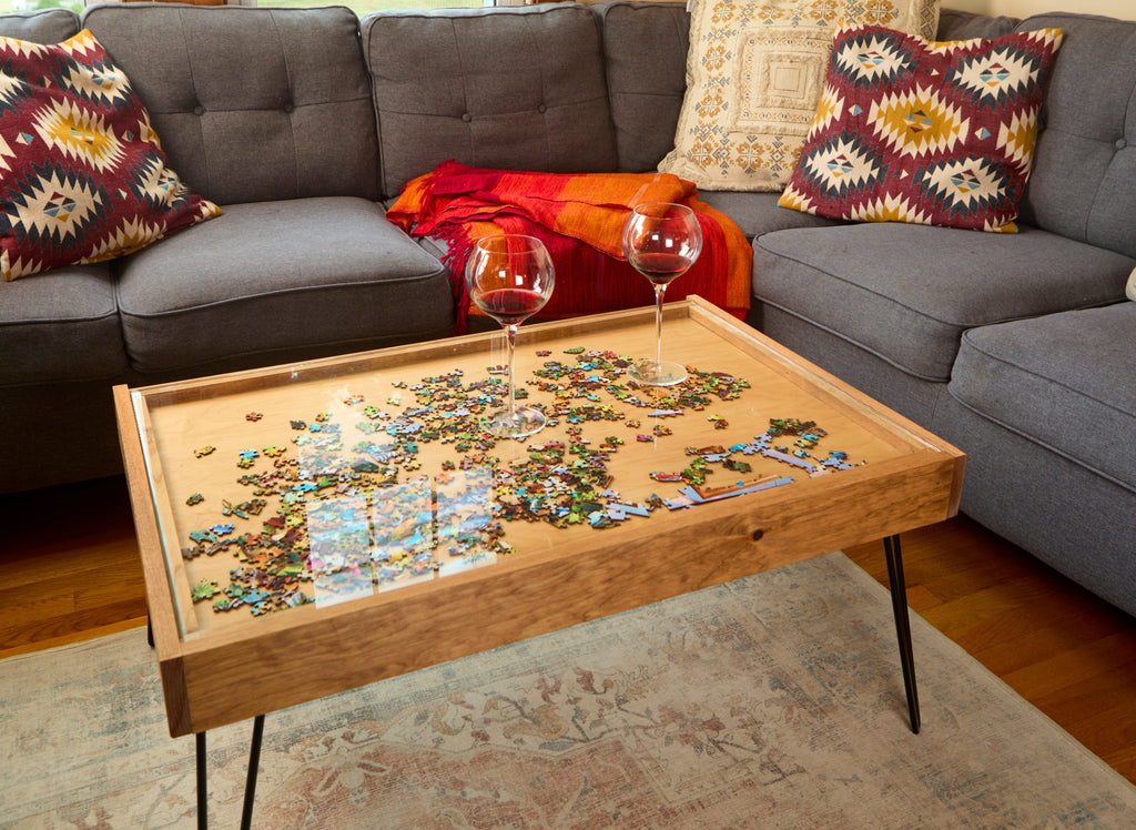 This beautiful 24x36" handcrafted rustic puzzle coffee table features a removable glass top, ample space for completing your favorite puzzles, and 2 hidden drawers to help you sort and store your puzzle or game pieces.