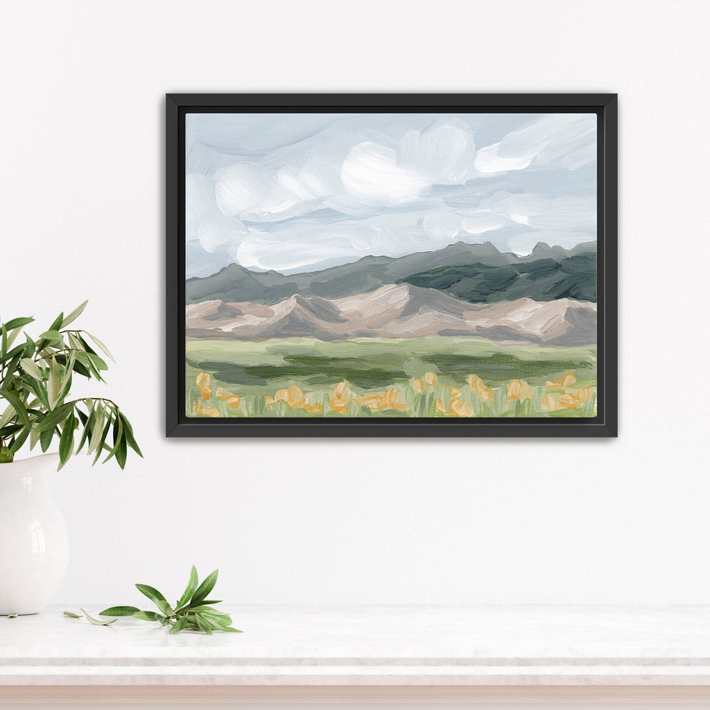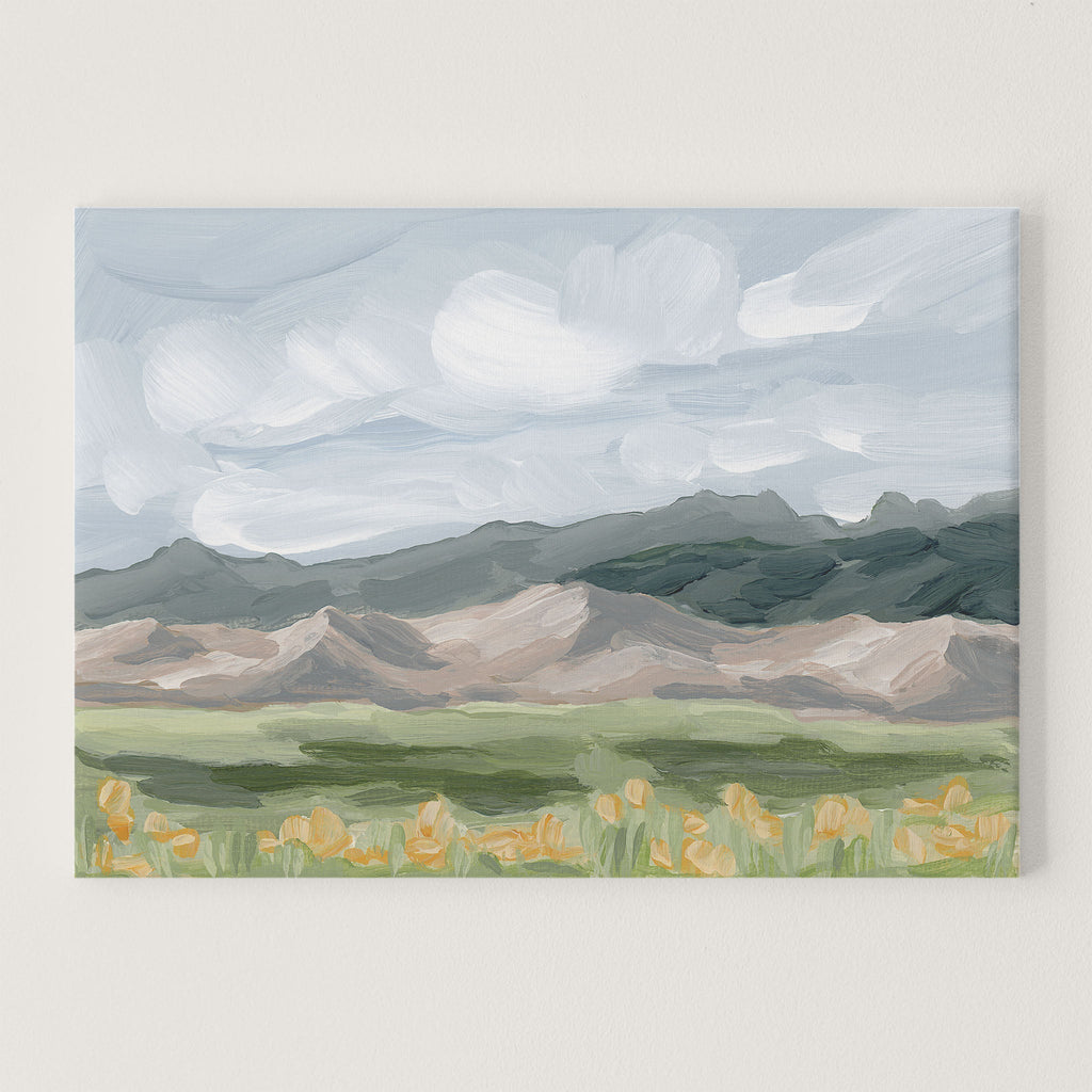 The fine art print of "Sand Dunes in Summer" is a reproduction of an original acrylic landscape painting inspired by the diverse and colorful scenery of Great Sand Dunes National Park in Alamosa, Colorado. With playful brushstrokes and vibrant colors, this mountain wall art captures the essence of the iconic Rocky Mountain landscape. Available in a variety of art print sizes, this landscape art print showcases a minimalist, impressionist style and is perfect for bringing the beauty of one of Colorado's favorite national parks into your home.