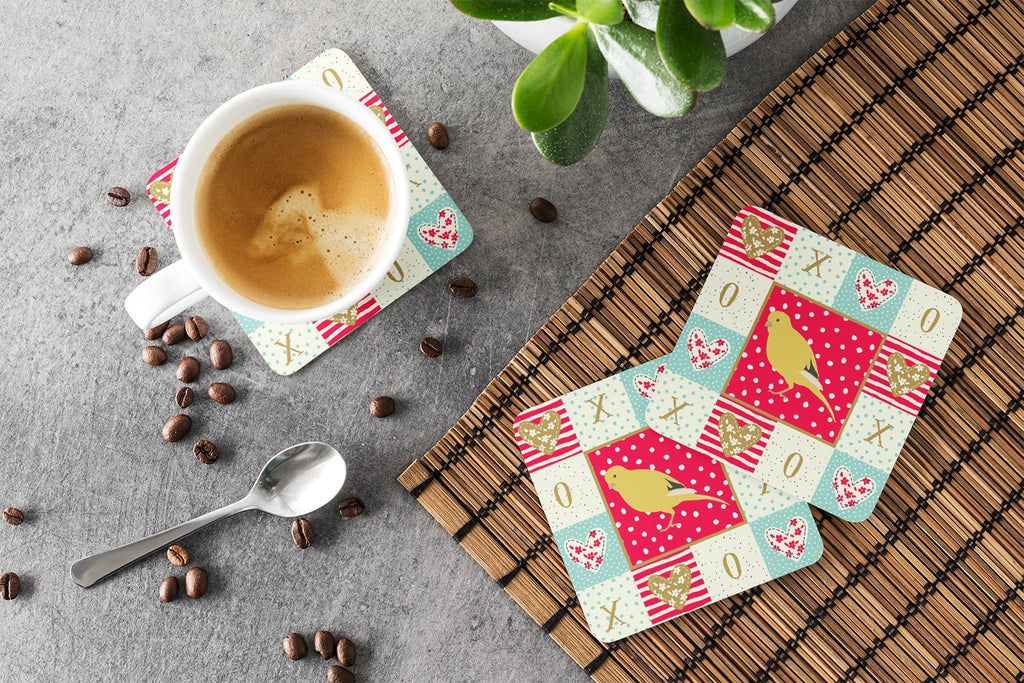 Decorate your space with our Valentine's Day artwork on a Coaster set. Presenting our Set of 4 Foam Coasters, a stylish and practical addition to your table setting. Each square coaster, measuring 3 1/2 inches by 3 1/2 inches, is perfectly sized to accommodate various drinkware, from coffee mugs to tumblers. These coasters stand out with their full-color artwork, permanently dyed onto the material for a vibrant and fade-resistant finish. They're not just functional, they're a fashionable statement, adding a touch of flair to any gathering or event. Our foam coasters serve a dual purpose - they protect your table from water stains and are perfect for both hot and cold drinks. The material used is similar to that of our high-quality mouse pads, ensuring durability and heat resistance. These coasters are easy to maintain - simply wash them in the top of your dishwasher and lay flat to dry. The design won't come off, ensuring they retain their vivid colors for years. Pair them with one of our insulated coolers or huggers for a cohesive, thoughtful gift set. Enhance your beverage experience with our Set of 4 Foam Coasters.