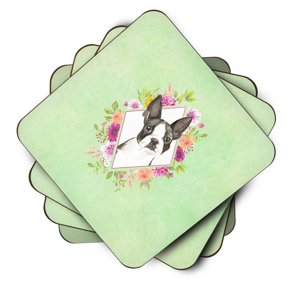 Boston Terrier Green Flowers Coasters - Set of 4 Lightweight Foam, Absorbent Drink Coasters CK4417FC