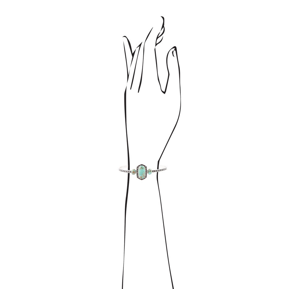 Shield your style with this unique and stunning Shielded Turquoise and Sterling Silver Cuff Bracelet! Handcrafted with genuine Sterling Silver and Turquoise, this timeless bracelet with an inner diameter of 2.5" fits most wrists since it can be stretched and squeezed. Front of bracelet is .8" in length and .5" in width. Make a statement with the glistening Turquoise stones placed in Sterling Silver bezels and an oxidized bezel design. Can you feel the power of this beautiful design?